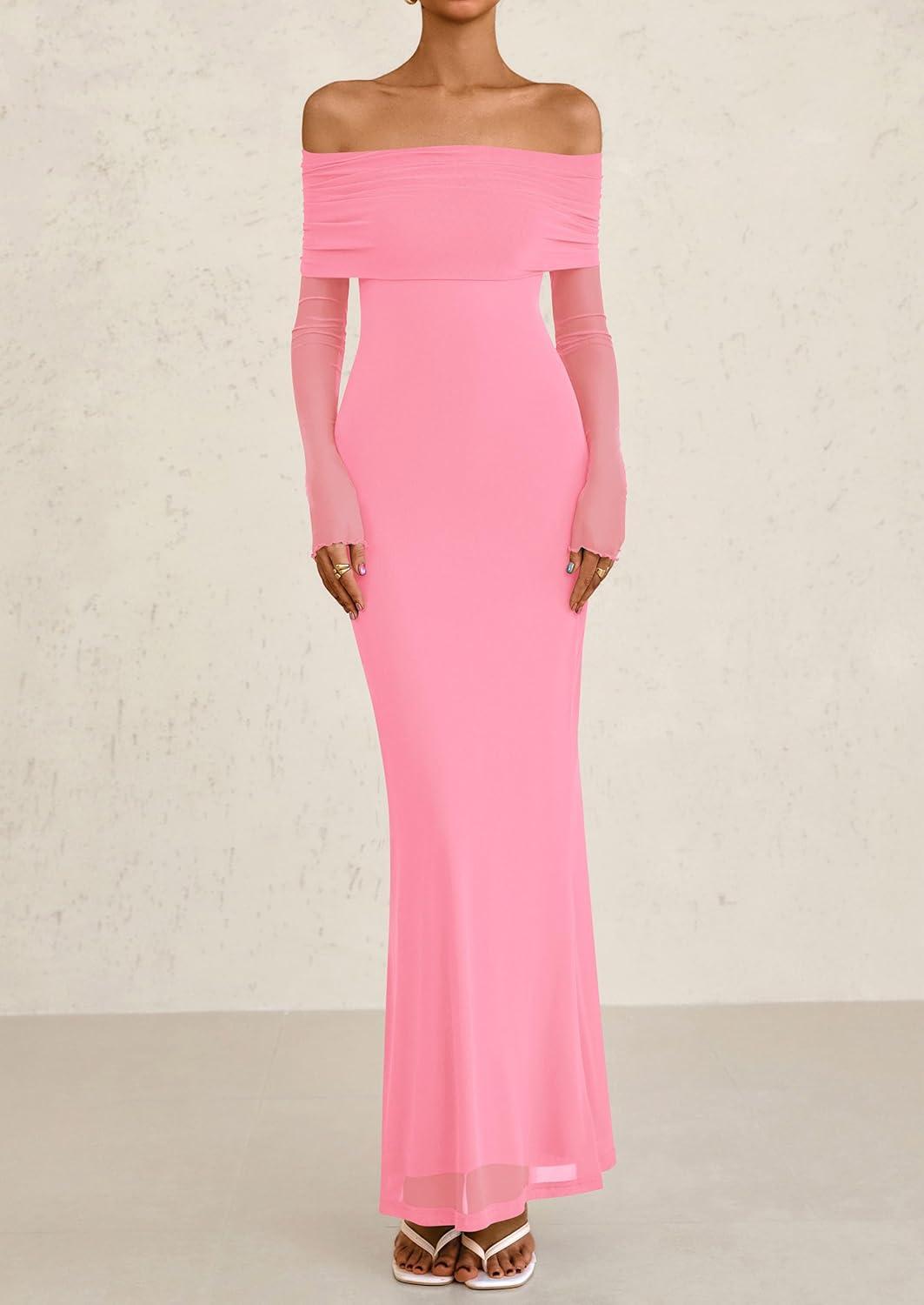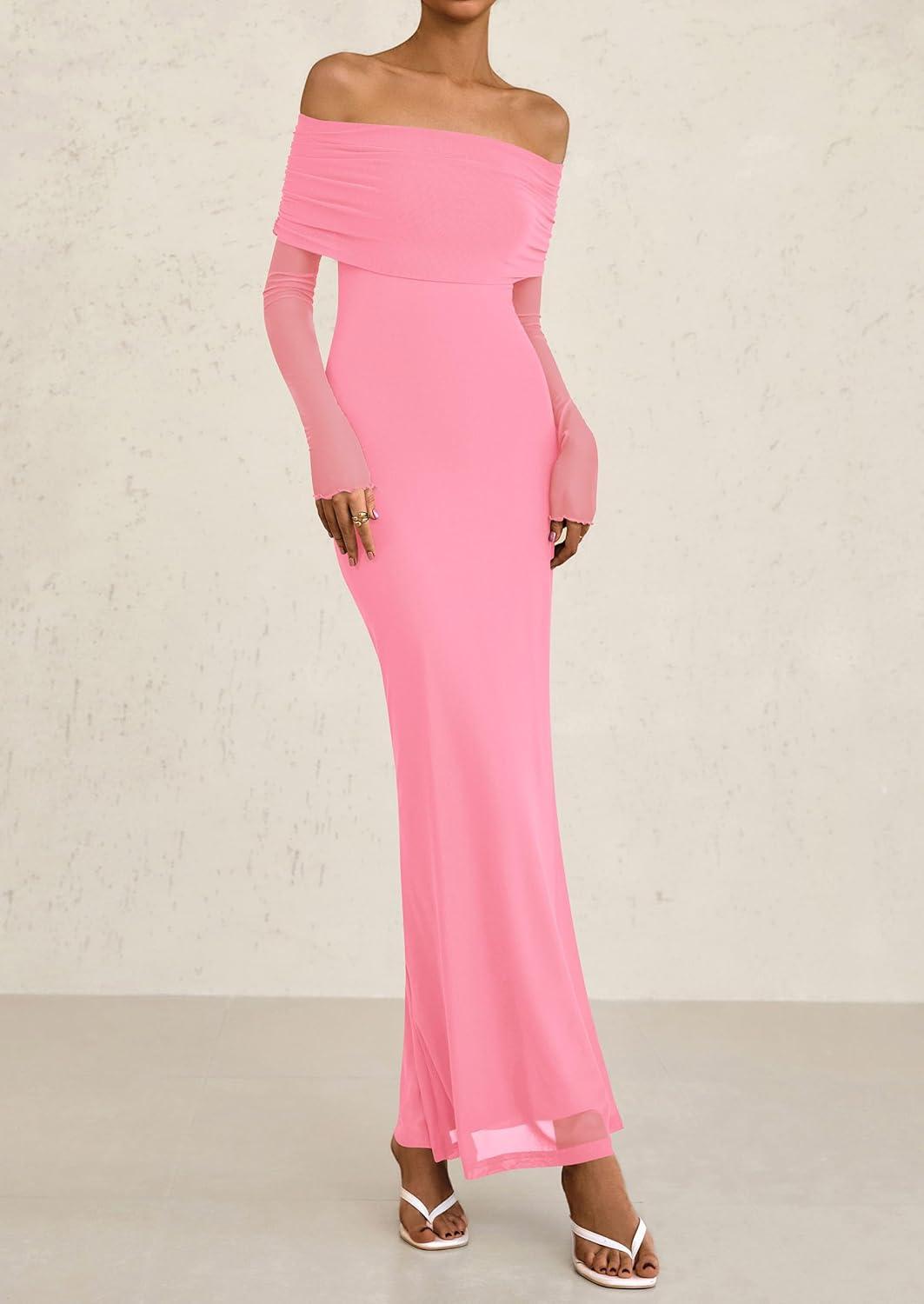 PRETTYGARDEN Fall Dresses for Women 2025 Elegant Off The Shoulder Long Sleeve Formal Wedding Guest Bodycon Maxi Dress(Pink)