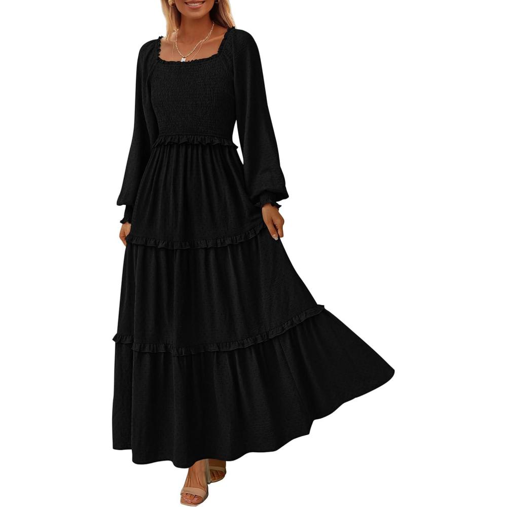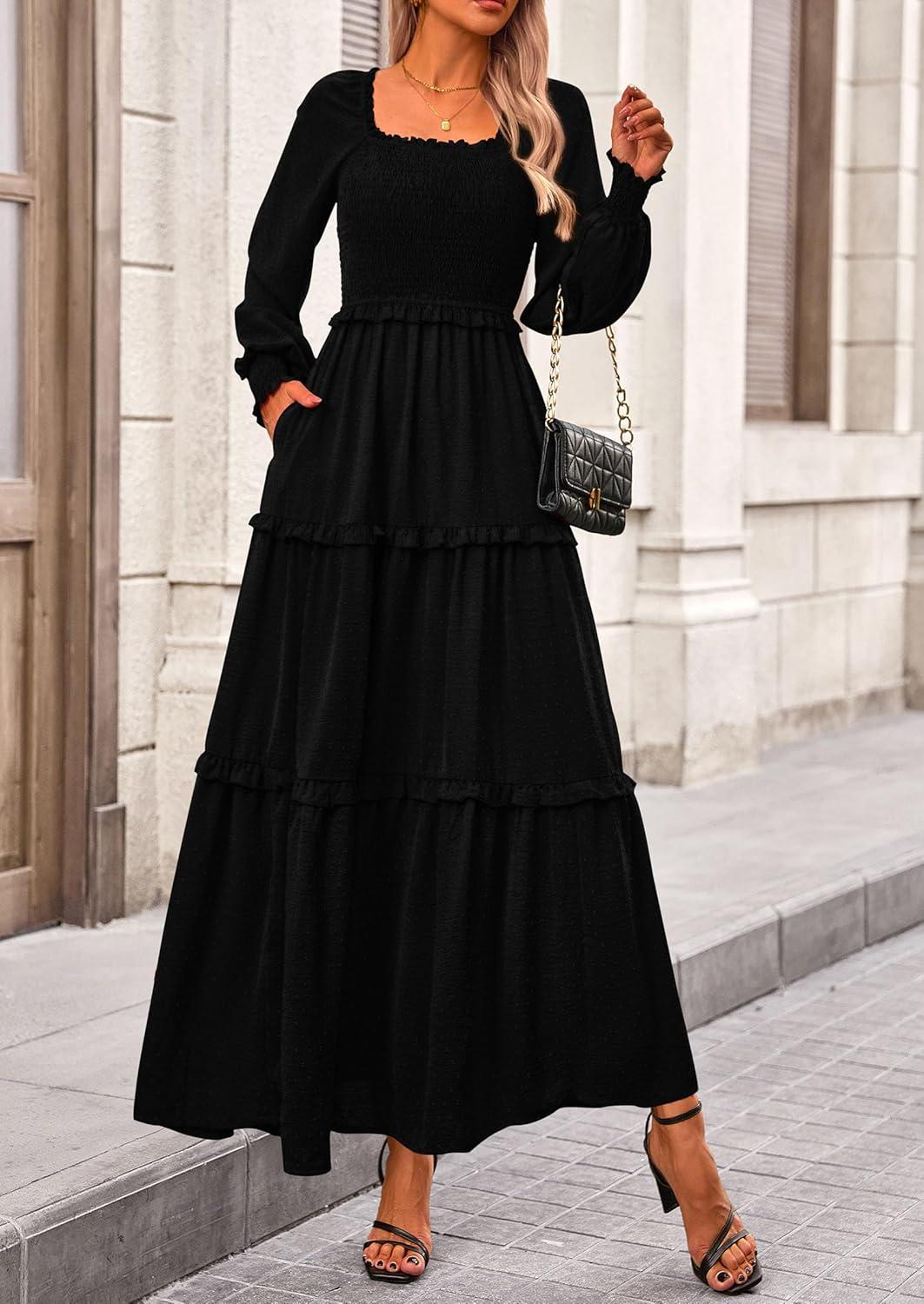 PRETTYGARDEN Fall Dresses for Women 2025 Long Sleeve Smocked Square Neck Swiss Dot Tiered Flowy Wedding Guest Maxi Dress(Black)