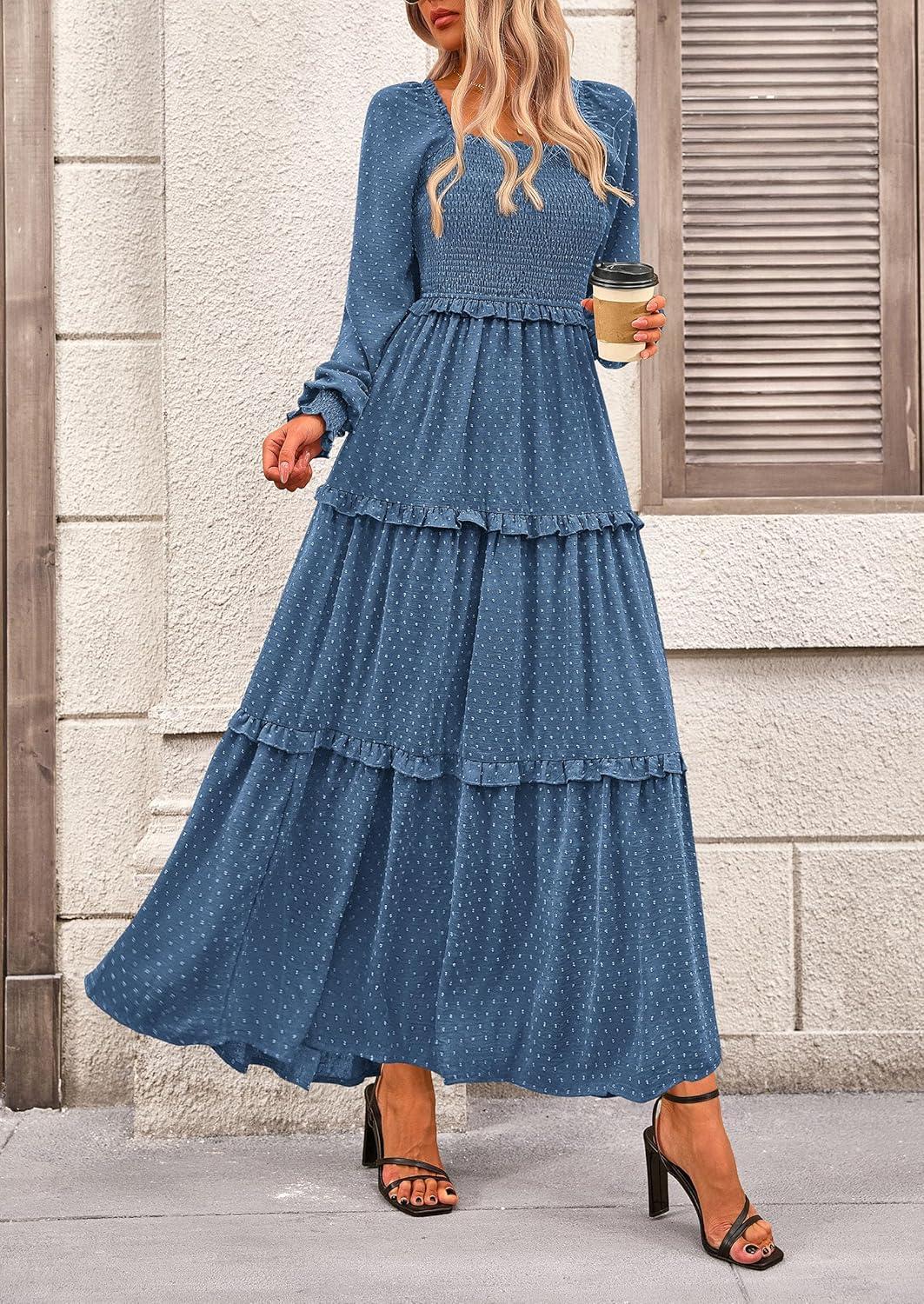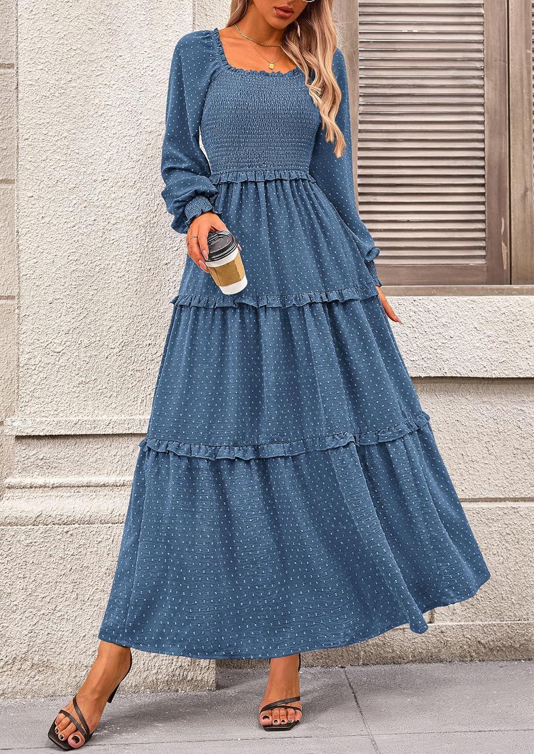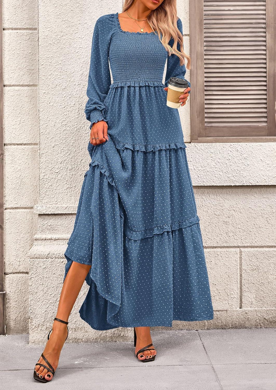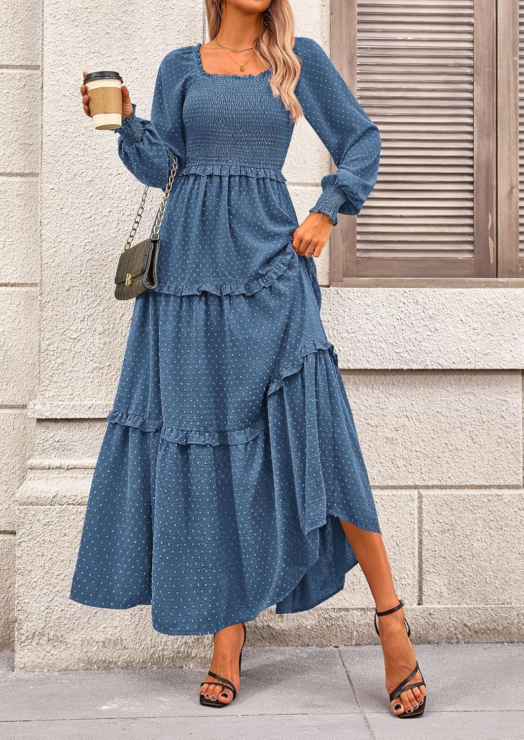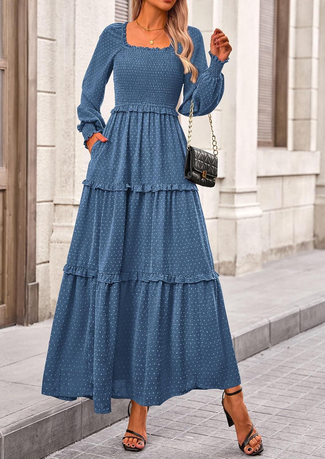 PRETTYGARDEN Fall Dresses for Women 2025 Long Sleeve Smocked Square Neck Swiss Dot Tiered Flowy Wedding Guest Maxi Dress(Dark Blue)