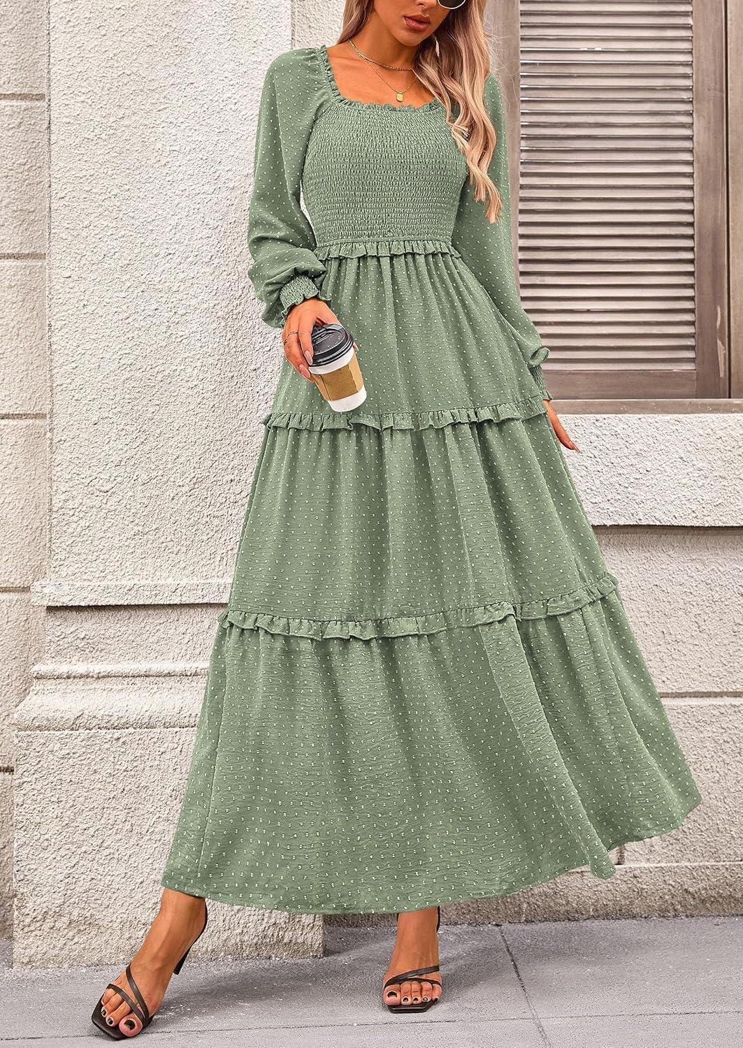 PRETTYGARDEN Fall Dresses for Women 2025 Long Sleeve Smocked Square Neck Swiss Dot Tiered Flowy Wedding Guest Maxi Dress(Dark Army Green)
