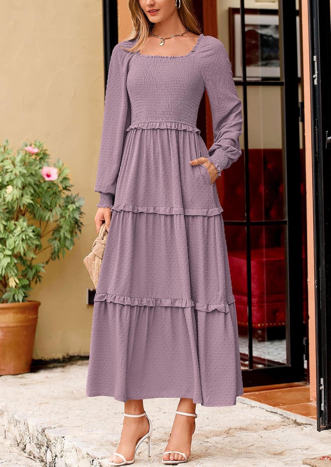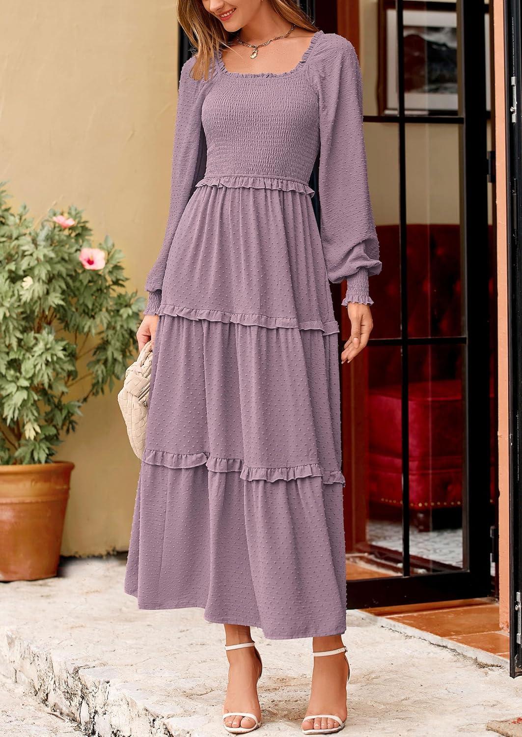 PRETTYGARDEN Fall Dresses for Women 2025 Long Sleeve Smocked Square Neck Swiss Dot Tiered Flowy Wedding Guest Maxi Dress(Grey Purple)