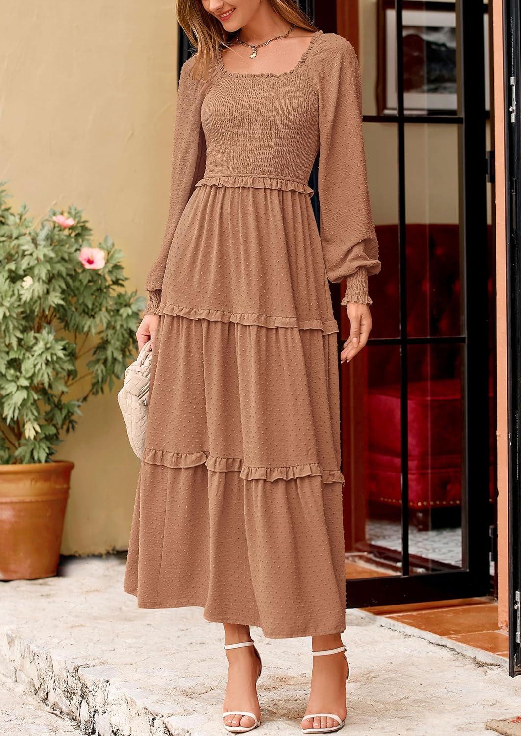PRETTYGARDEN Fall Dresses for Women 2025 Long Sleeve Smocked Square Neck Swiss Dot Tiered Flowy Wedding Guest Maxi Dress(Khaki)