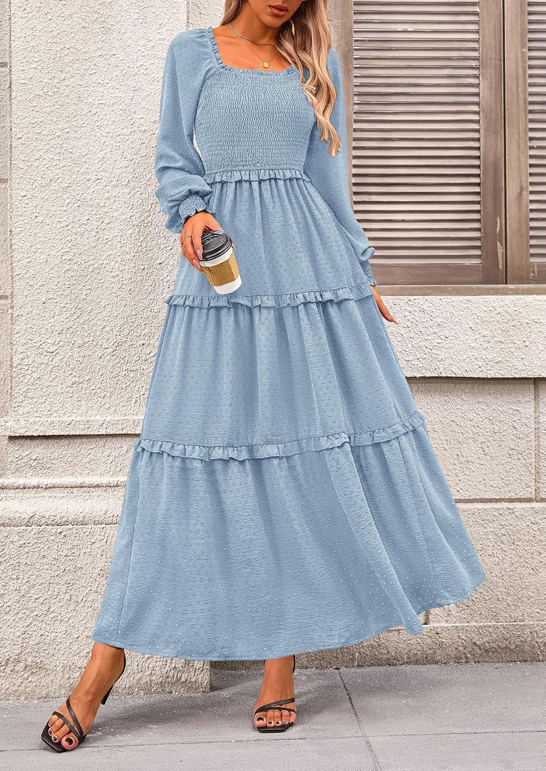 PRETTYGARDEN Fall Dresses for Women 2025 Long Sleeve Smocked Square Neck Swiss Dot Tiered Flowy Wedding Guest Maxi Dress(Light Blue)