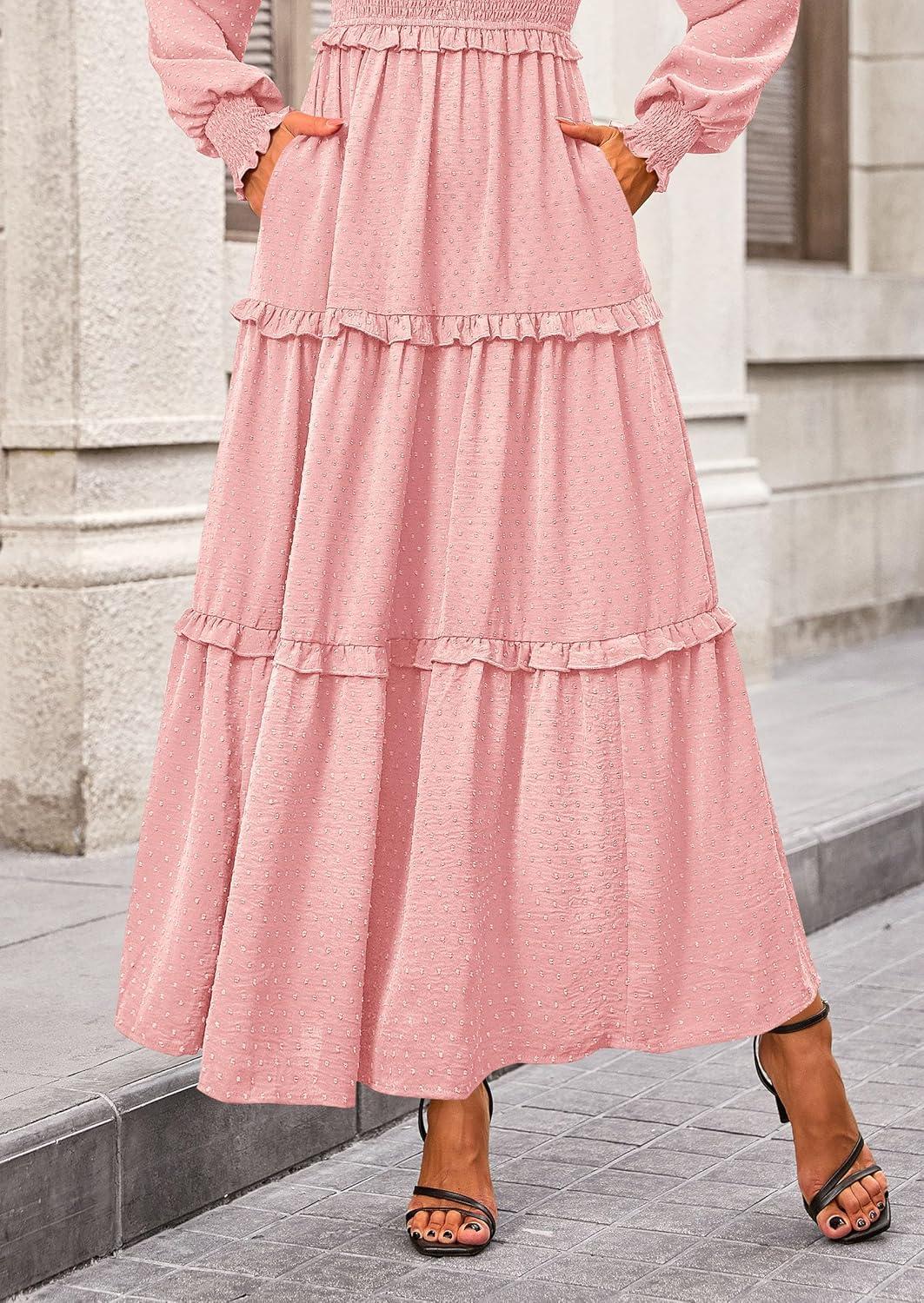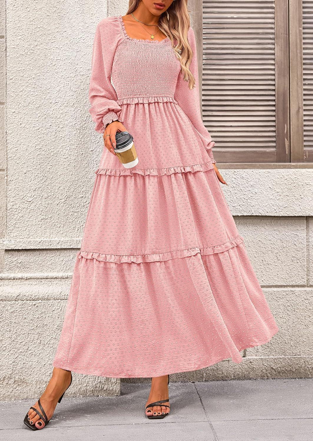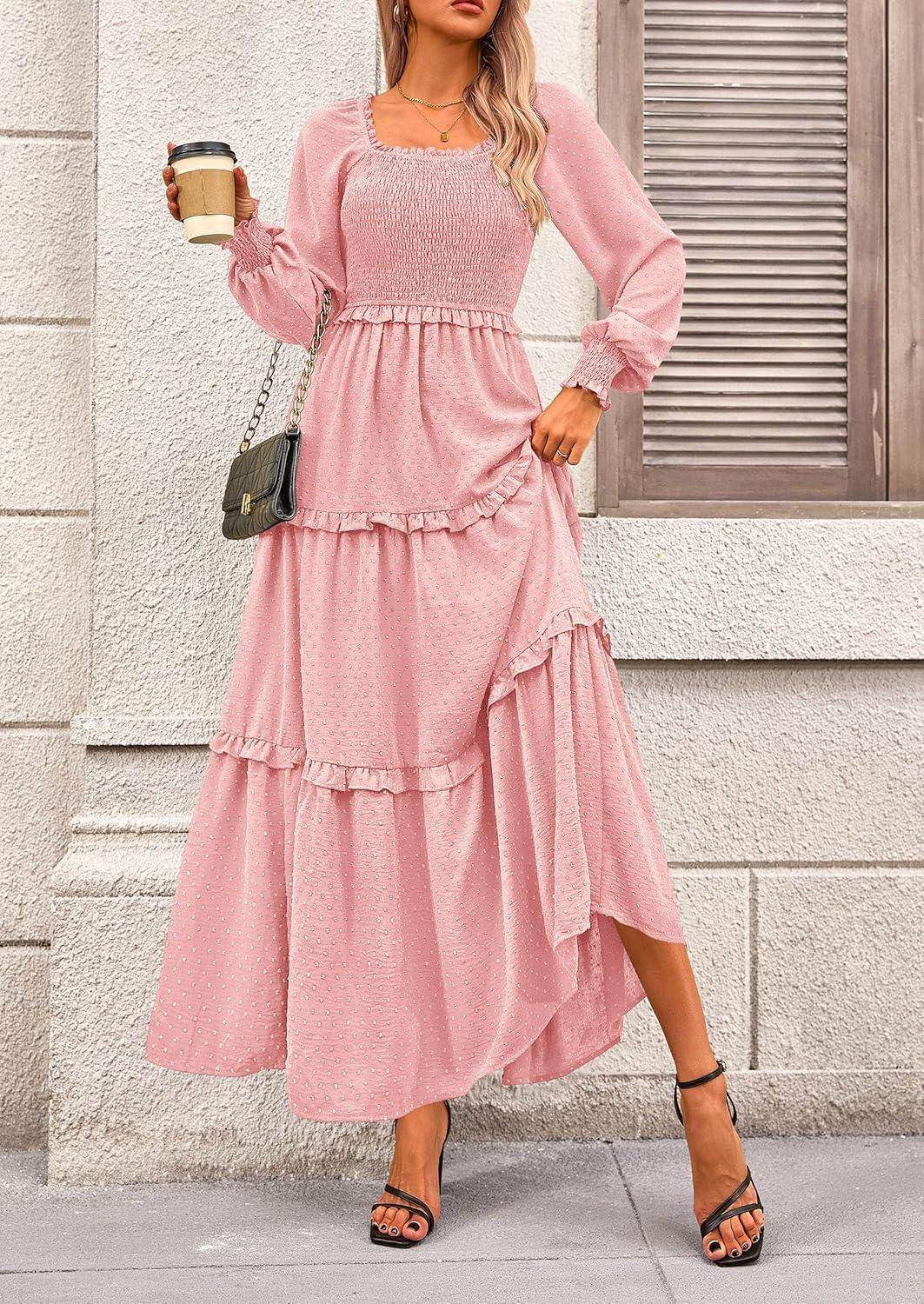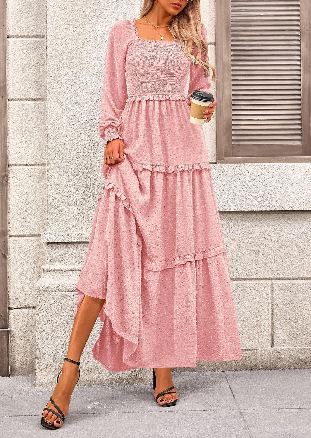 PRETTYGARDEN Fall Dresses for Women 2025 Long Sleeve Smocked Square Neck Swiss Dot Tiered Flowy Wedding Guest Maxi Dress(Pink)