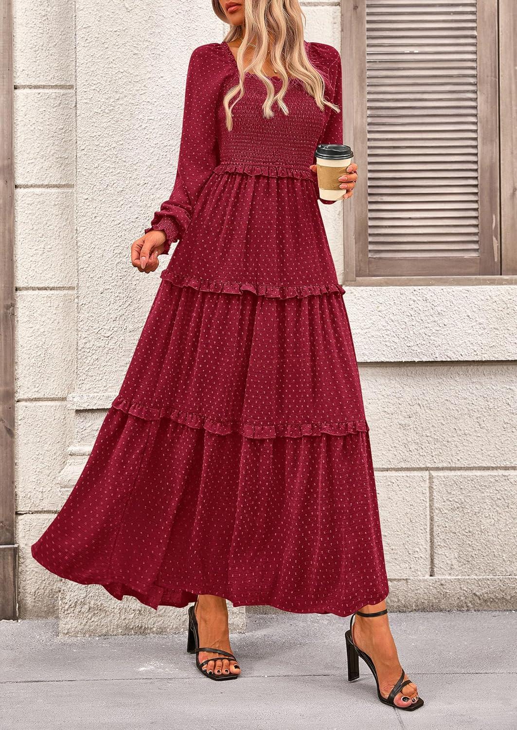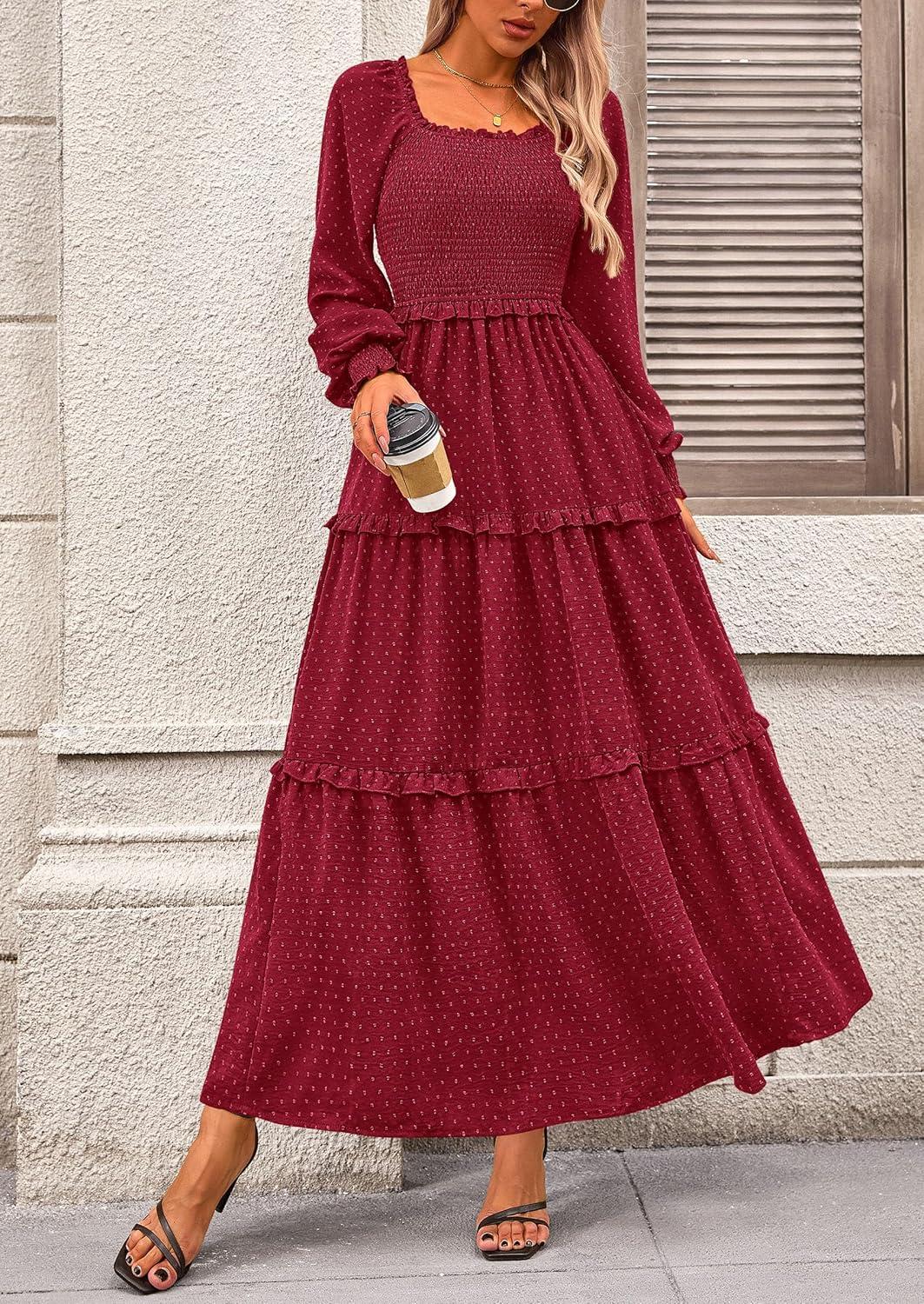 PRETTYGARDEN Fall Dresses for Women 2025 Long Sleeve Smocked Square Neck Swiss Dot Tiered Flowy Wedding Guest Maxi Dress(Wine Red)