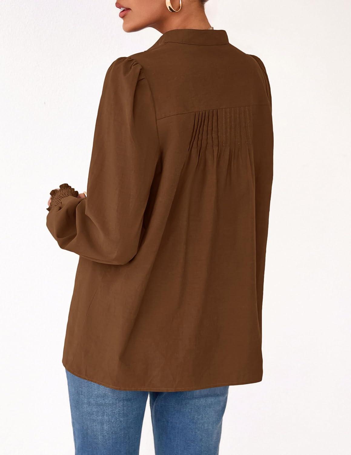imagePRETTYGARDEN Fall Lantern Long Sleeve Shirts for Women 2025 Trendy Button Vneck Pullover Henley Tops Dressy Work BlousesBrown