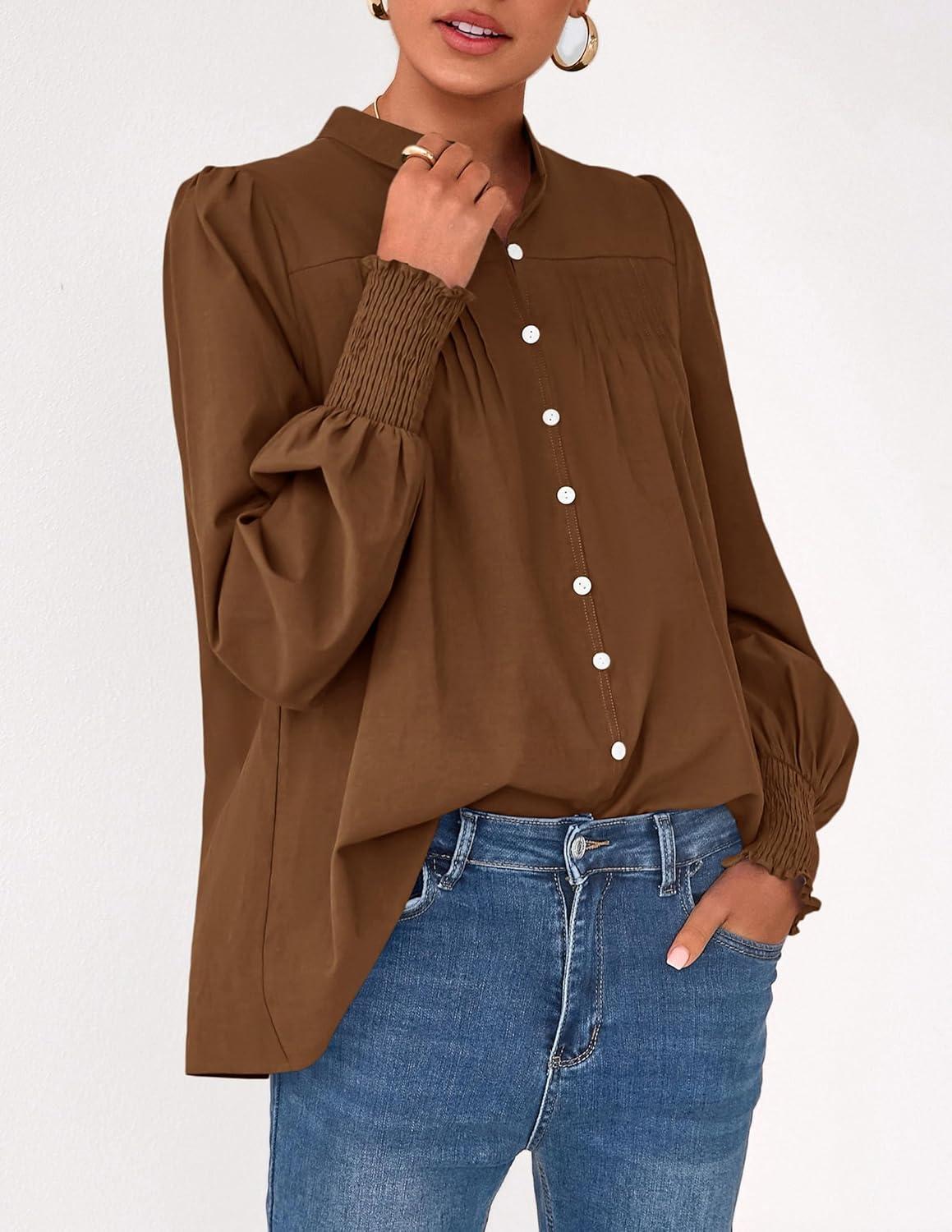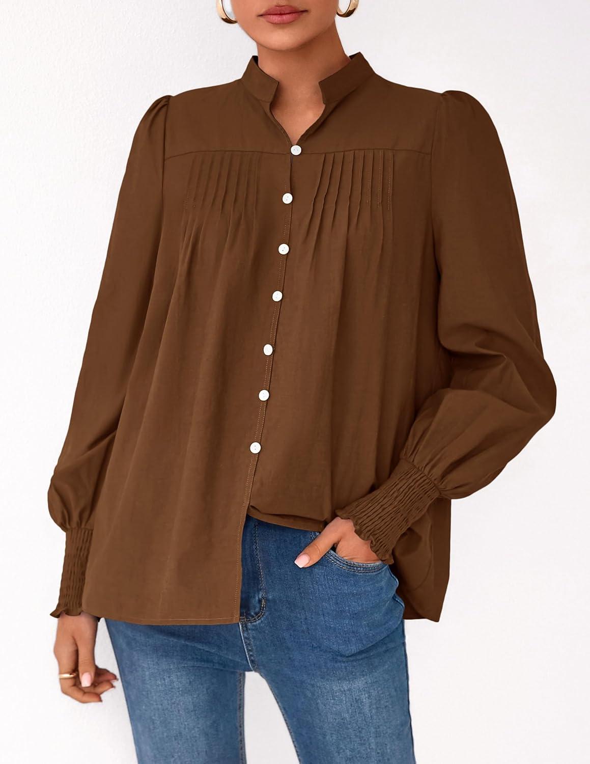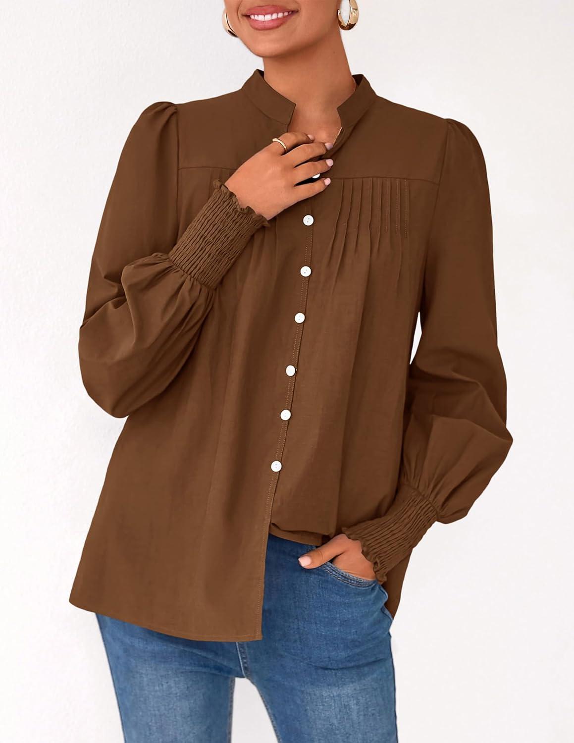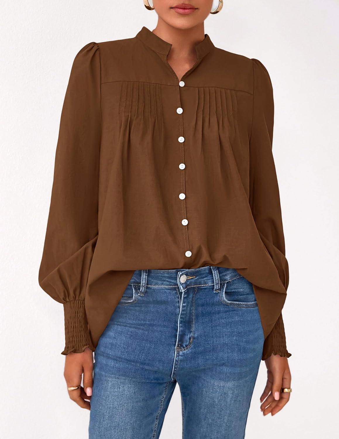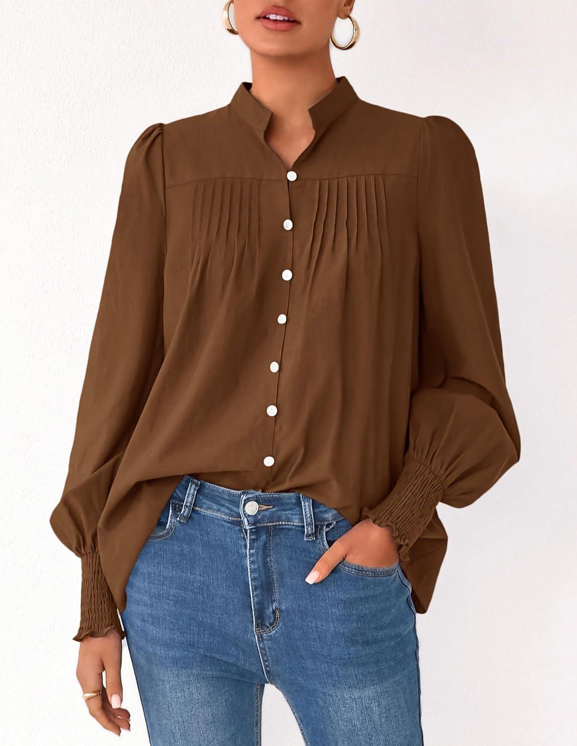 PRETTYGARDEN Fall Lantern Long Sleeve Shirts for Women 2025 Trendy Button Vneck Pullover Henley Tops Dressy Work Blouses(Brown)