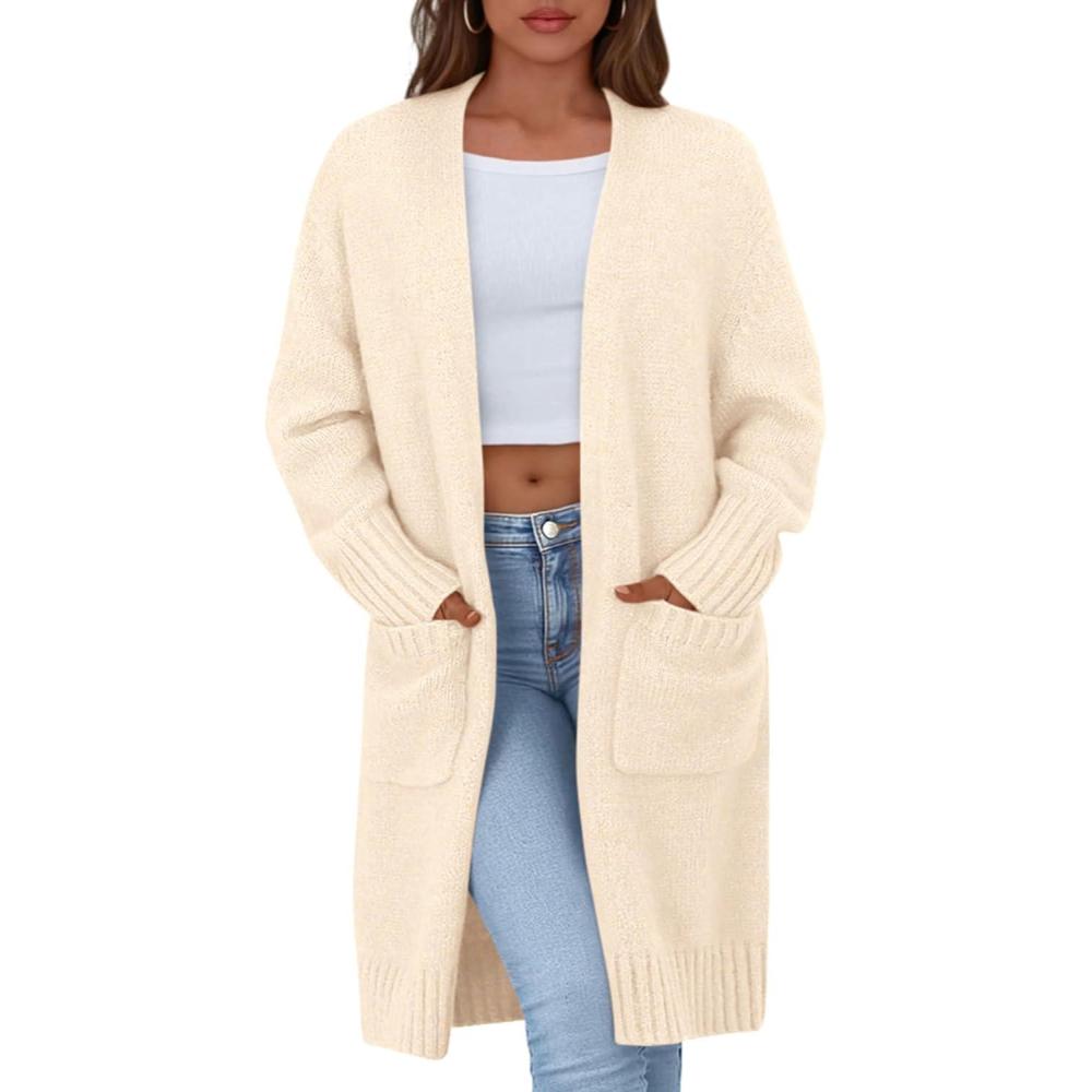 PRETTYGARDEN Fall Long Sleeve Cardigan Sweaters for Women 2025 Trendy Winter Open Front Loose Knitted Cardigans with Pockets(Beige)