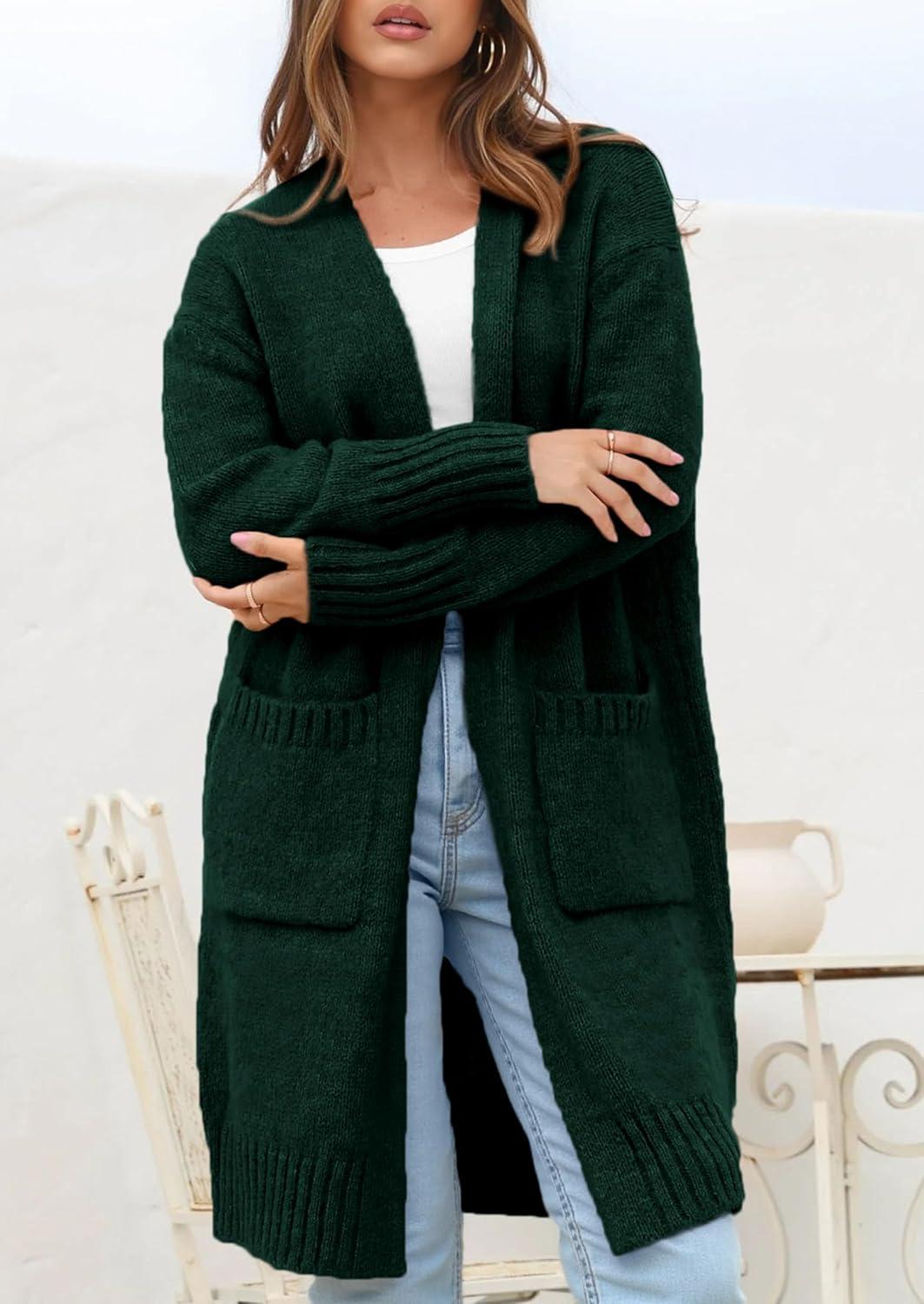 PRETTYGARDEN Fall Long Sleeve Cardigan Sweaters for Women 2025 Trendy Winter Open Front Loose Knitted Cardigans with Pockets(Dark Green)