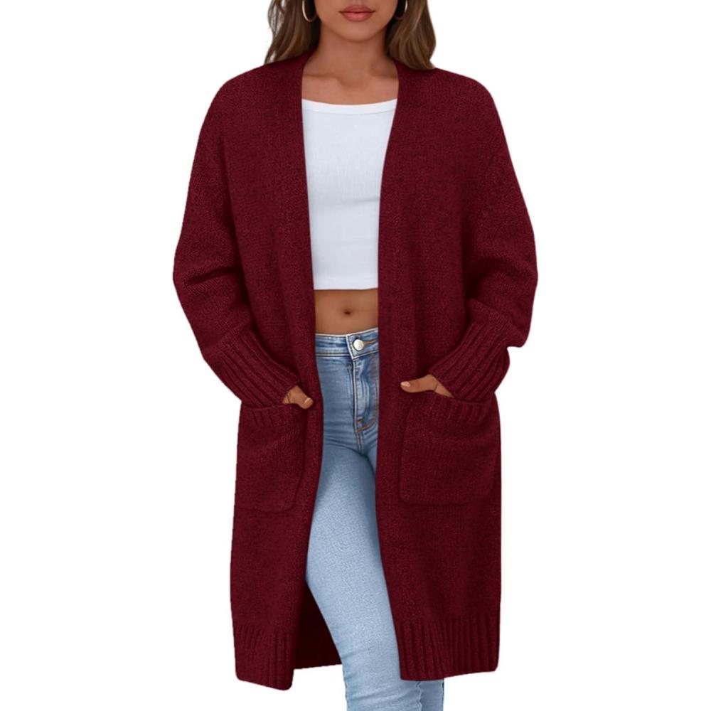 PRETTYGARDEN Fall Long Sleeve Cardigan Sweaters for Women 2025 Trendy Winter Open Front Loose Knitted Cardigans with Pockets(Wine Red)