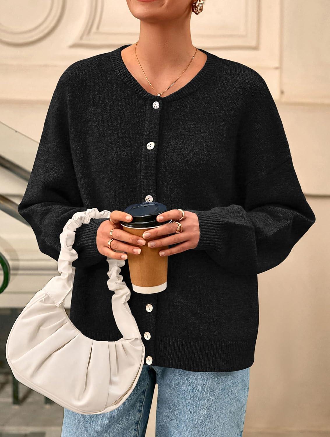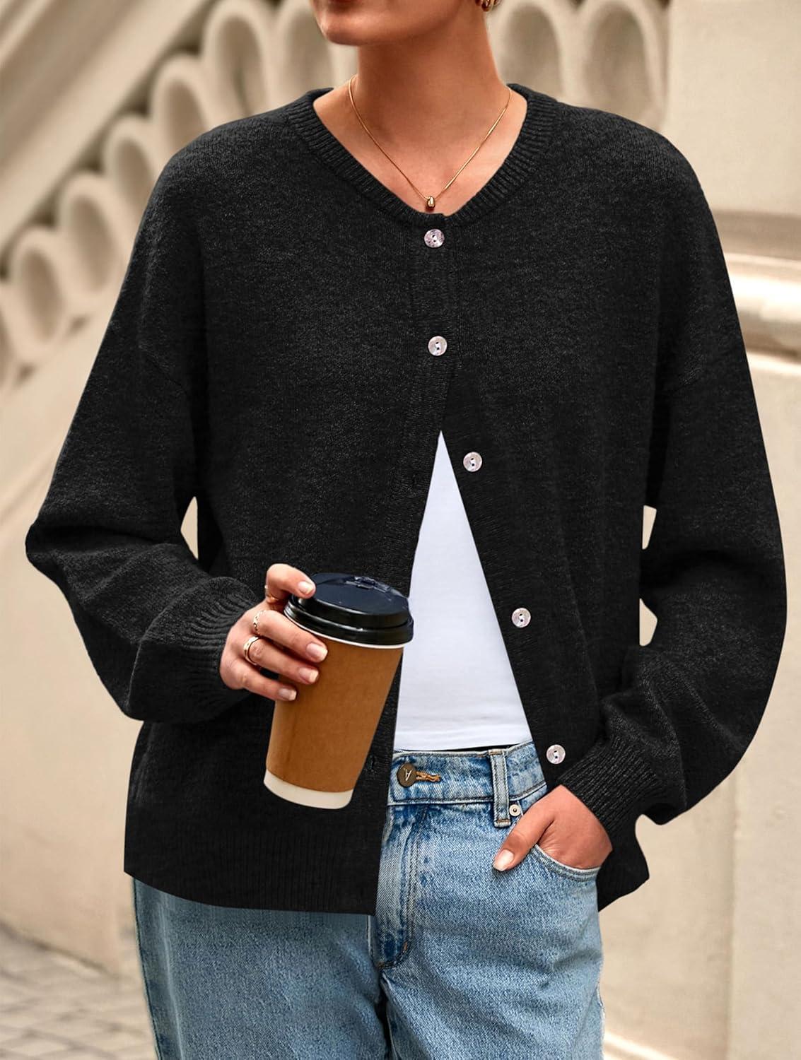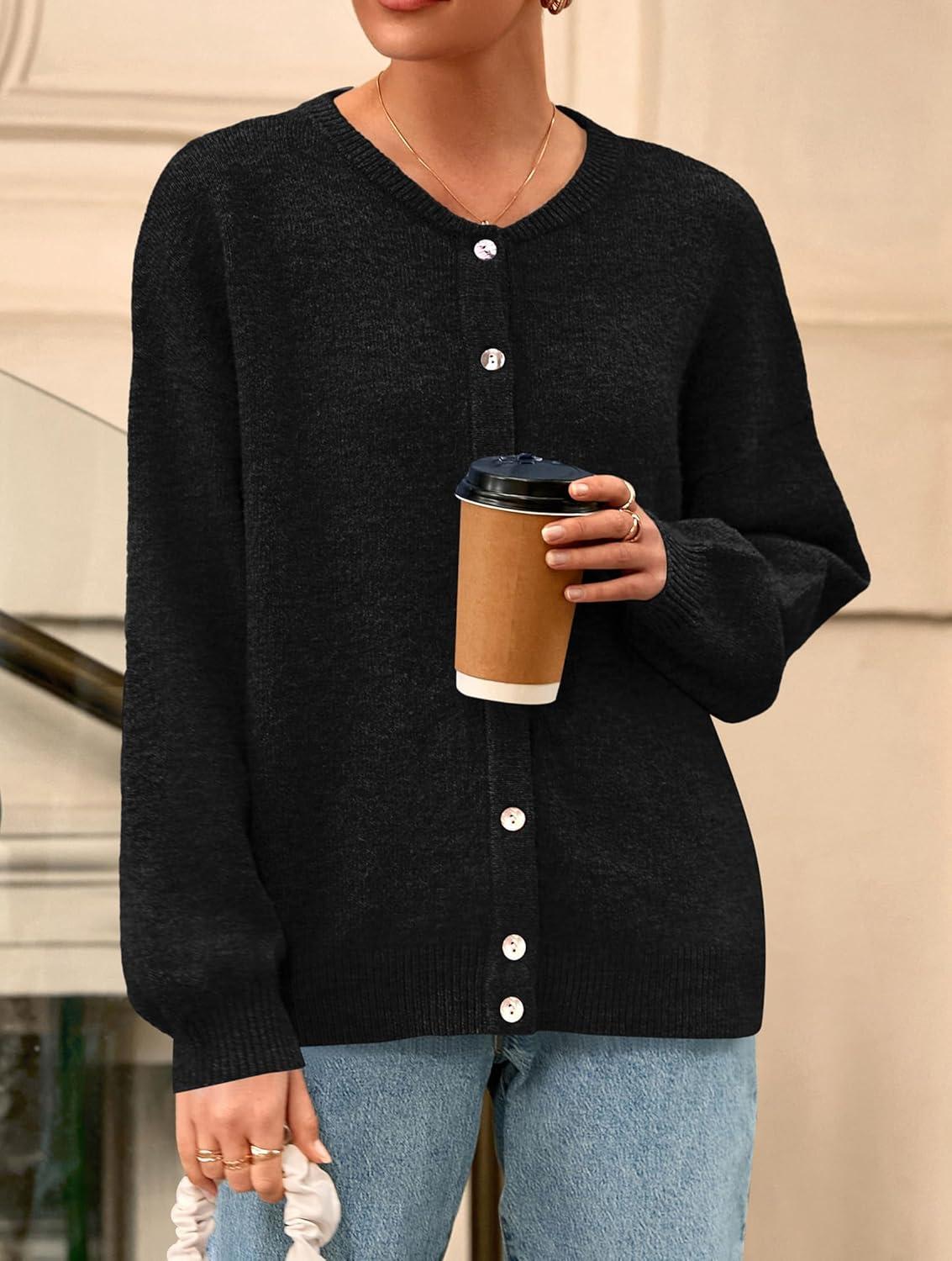 PRETTYGARDEN Fall Long Sleeve Cardigans for Women Trendy 2025 Lightweight Button Down Crewneck Loose Knit Sweater Clothes(Black)