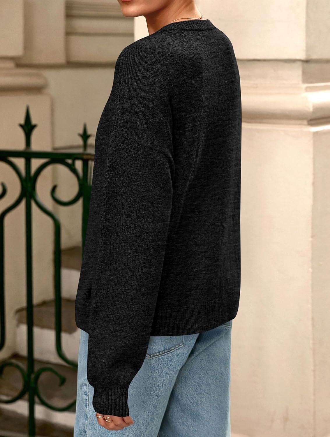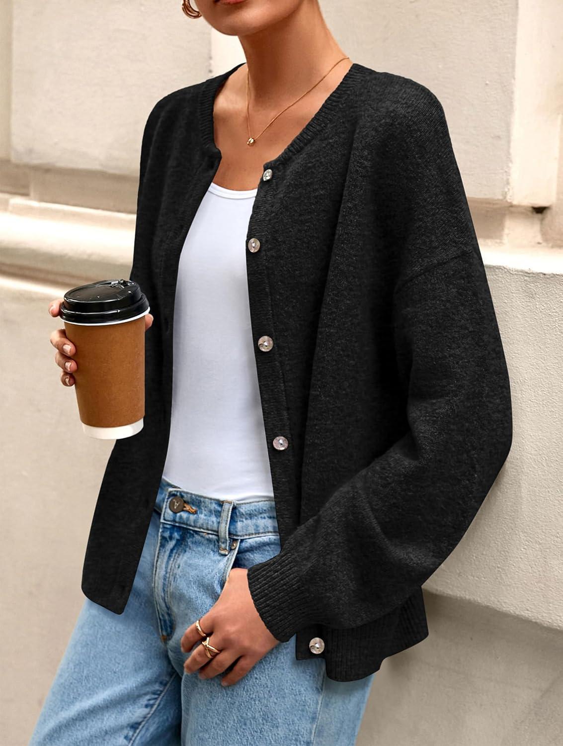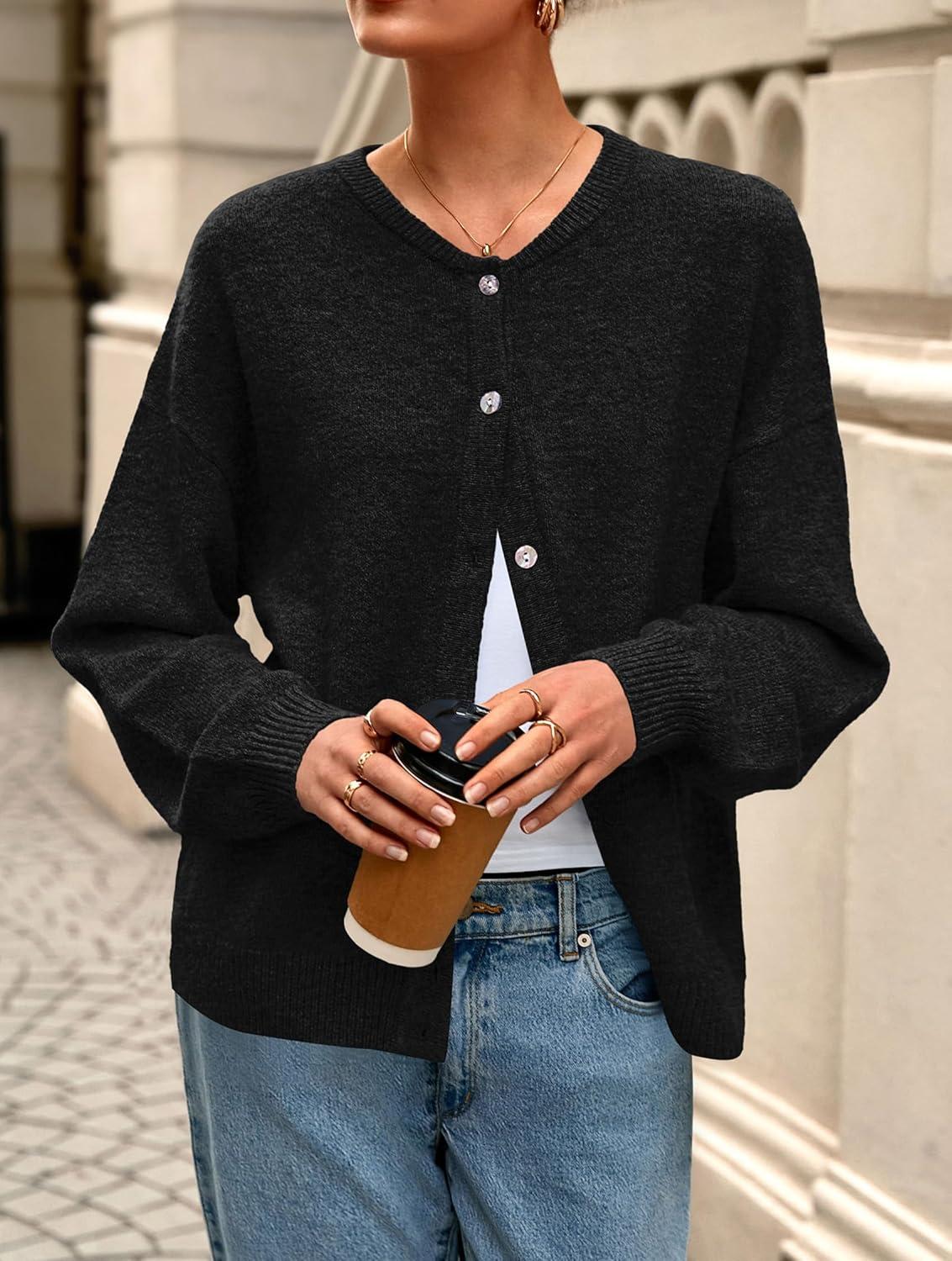 PRETTYGARDEN Fall Long Sleeve Cardigans for Women Trendy 2025 Lightweight Button Down Crewneck Loose Knit Sweater Clothes(Black)
