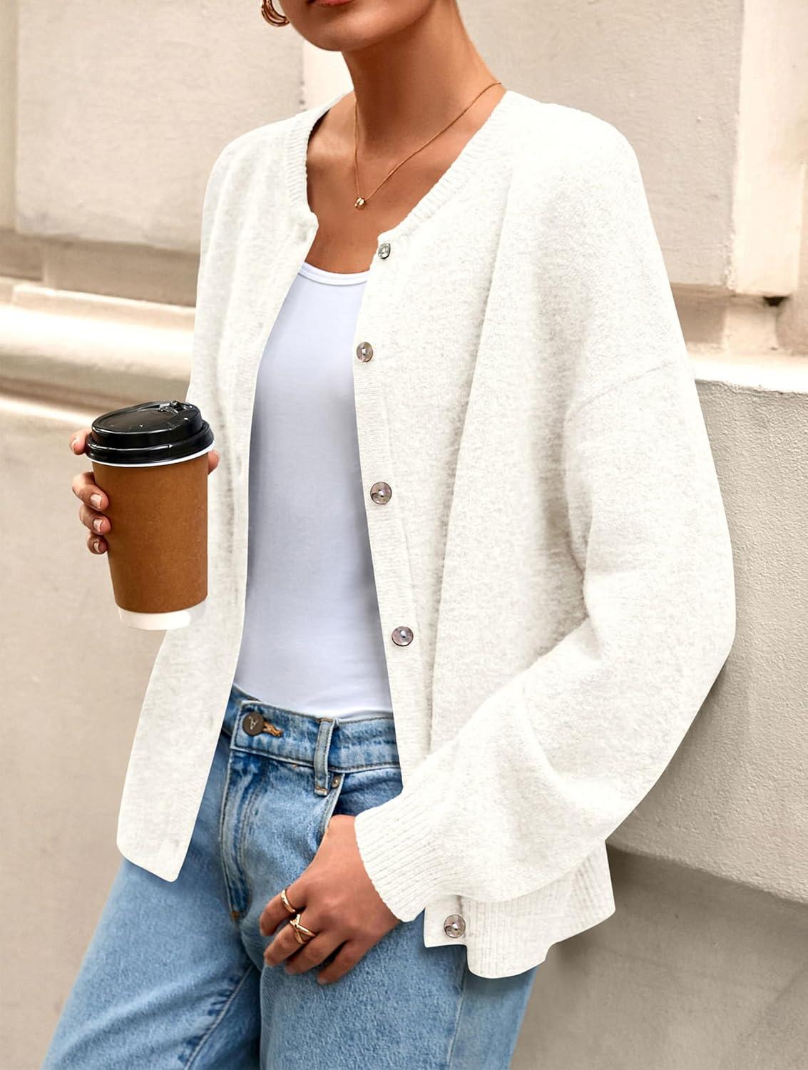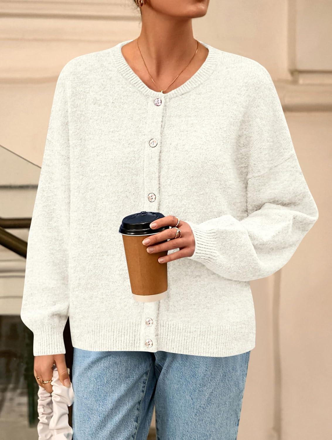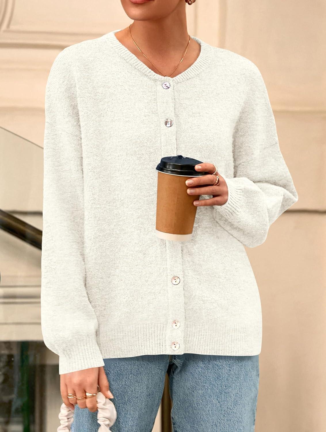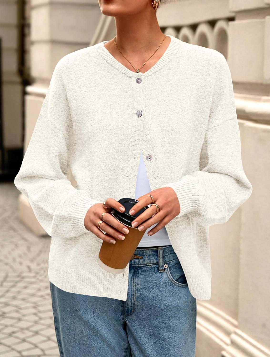 PRETTYGARDEN Fall Long Sleeve Cardigans for Women Trendy 2025 Lightweight Button Down Crewneck Loose Knit Sweater Clothes(White)