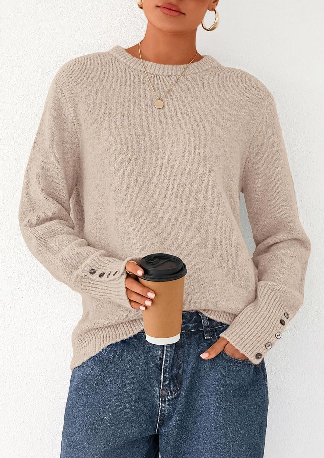 PRETTYGARDEN Fall Sweaters for Women 2025 Cozy Casual Crewneck Pullover Button Long Sleeve Knit Tops Winter Fashion Clothing(Beige)