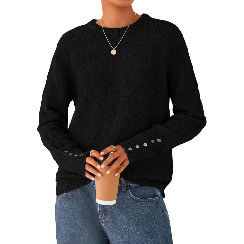 imagePRETTYGARDEN Fall Sweaters for Women 2025 Cozy Casual Crewneck Pullover Button Long Sleeve Knit Tops Winter Fashion ClothingBlack
