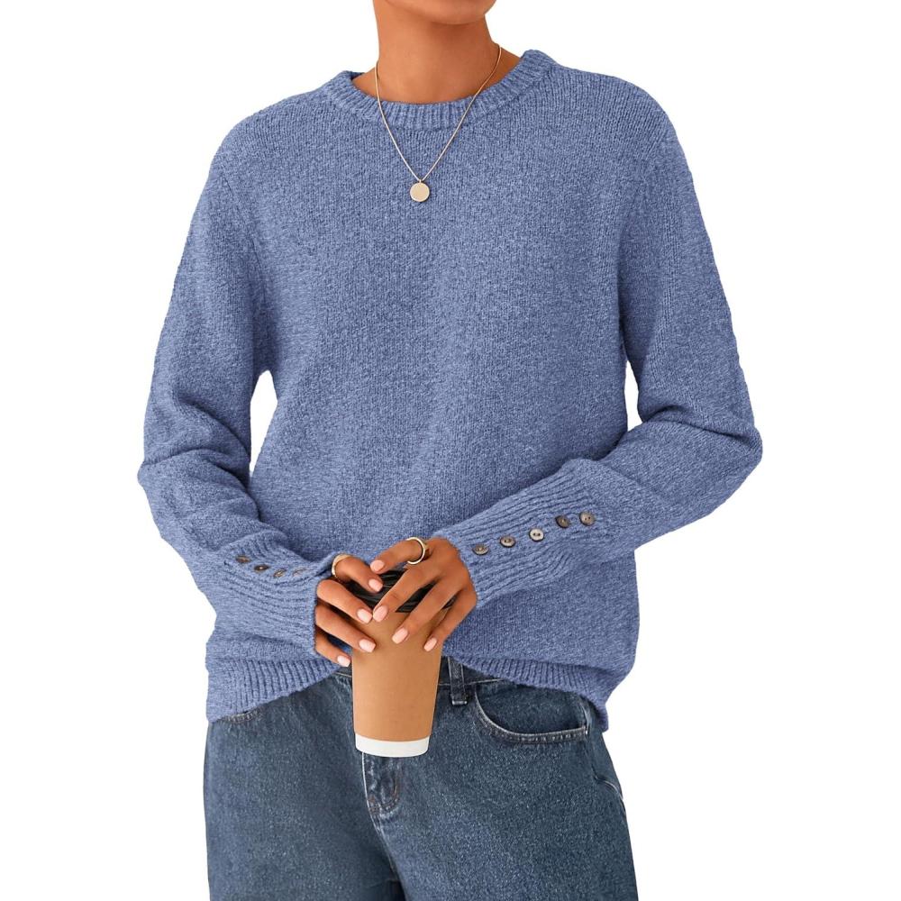 imagePRETTYGARDEN Fall Sweaters for Women 2025 Cozy Casual Crewneck Pullover Button Long Sleeve Knit Tops Winter Fashion ClothingBlue