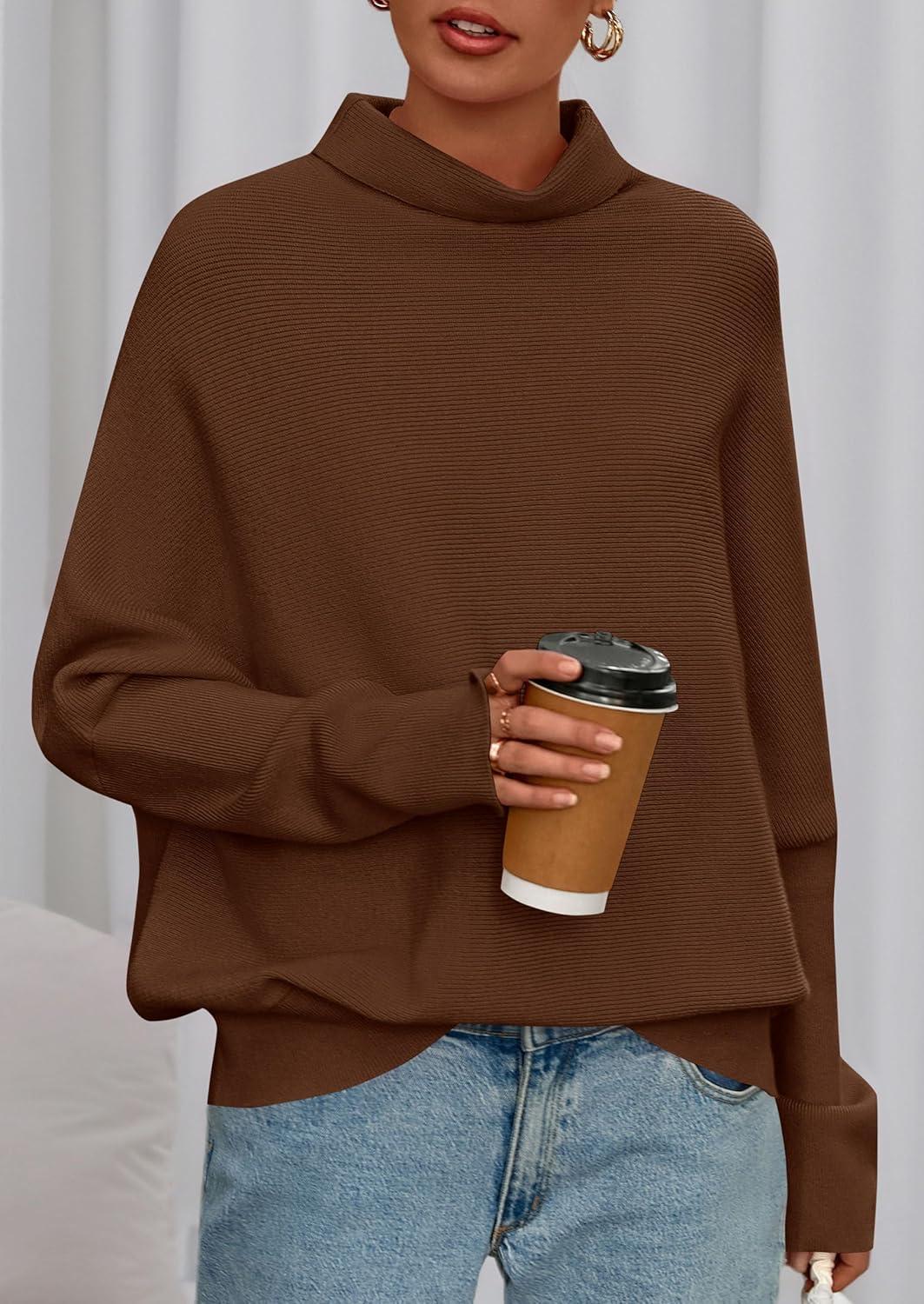 PRETTYGARDEN Fall Sweaters for Women 2025 Winter Clothing Batwing Long Sleeve Casual Tops Loose Knit Turtleneck Sweater(Brown)