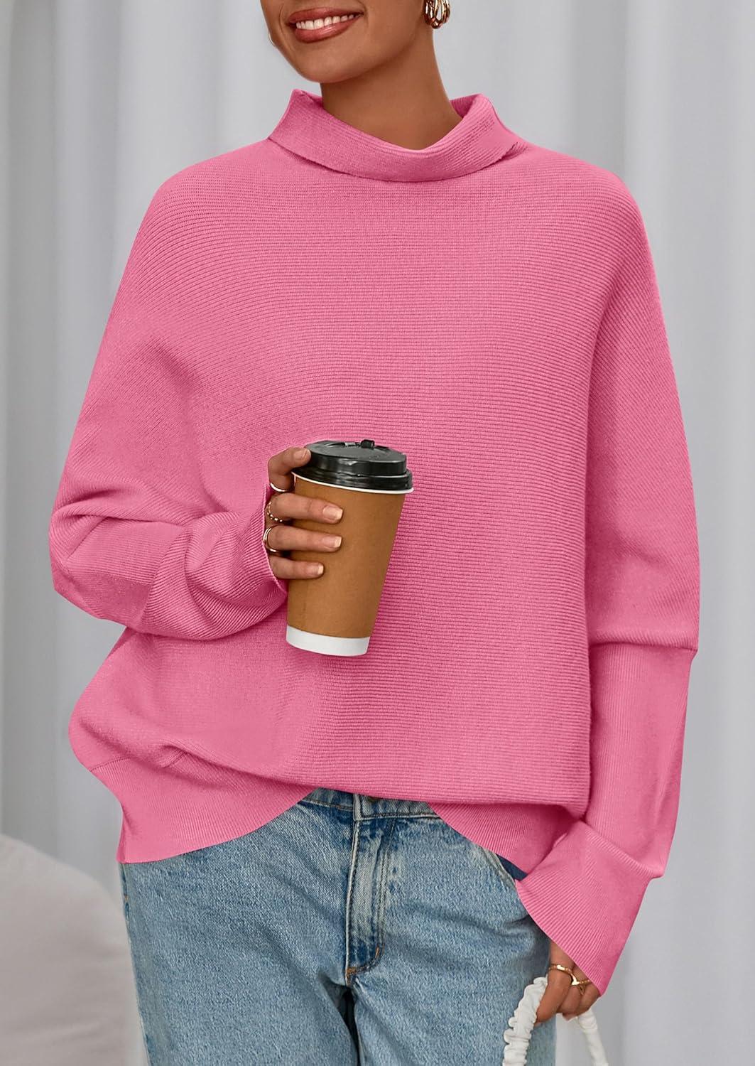 PRETTYGARDEN Fall Sweaters for Women 2025 Winter Clothing Batwing Long Sleeve Casual Tops Loose Knit Turtleneck Sweater(Pink)