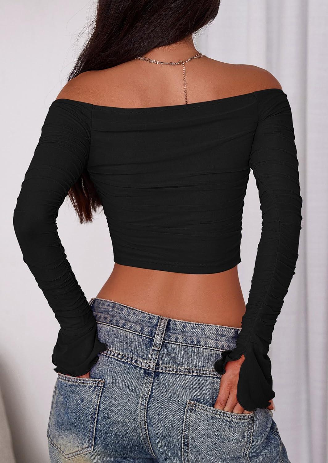 PRETTYGARDEN Fall Tops for Women 2025 Trendy Long Sleeve Crop Mesh Slim Fit Y2K Cute Shirts Going Out Off The Shoulder Top(Black)