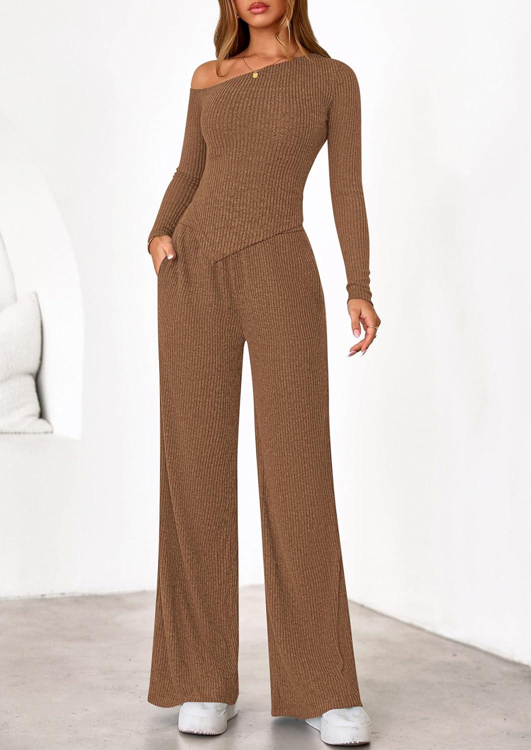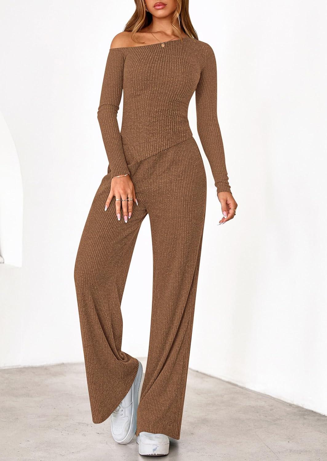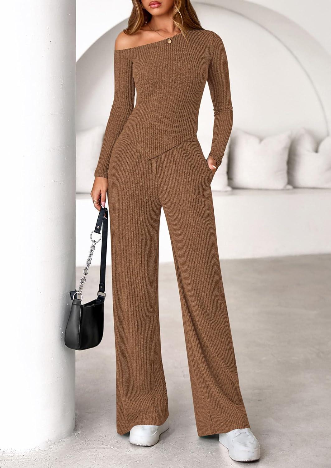 PRETTYGARDEN Fall Two Piece Sets For Women 2025 Off Shoulder Tops Long Pants Knit Matching Lounge Set Airport Travel Outfits(Brown)