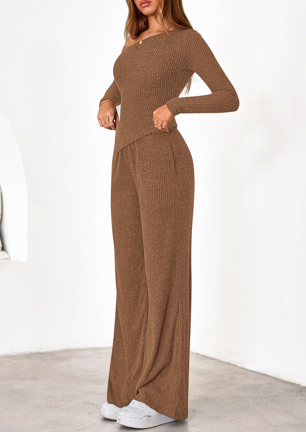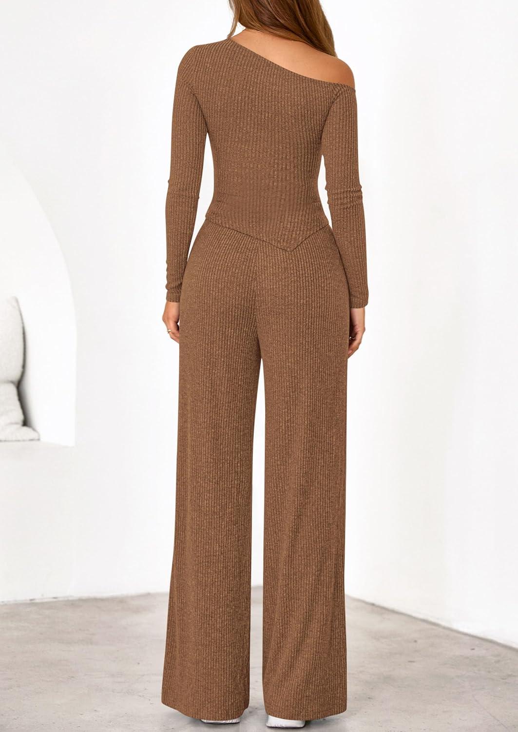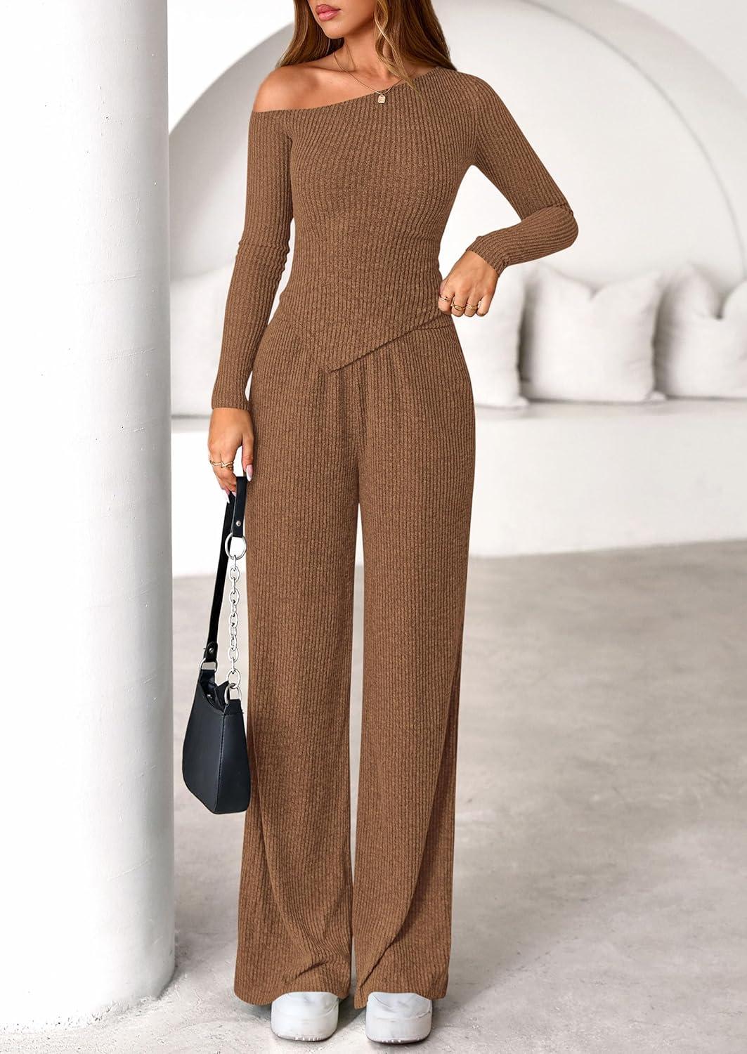 PRETTYGARDEN Fall Two Piece Sets For Women 2025 Off Shoulder Tops Long Pants Knit Matching Lounge Set Airport Travel Outfits(Brown)