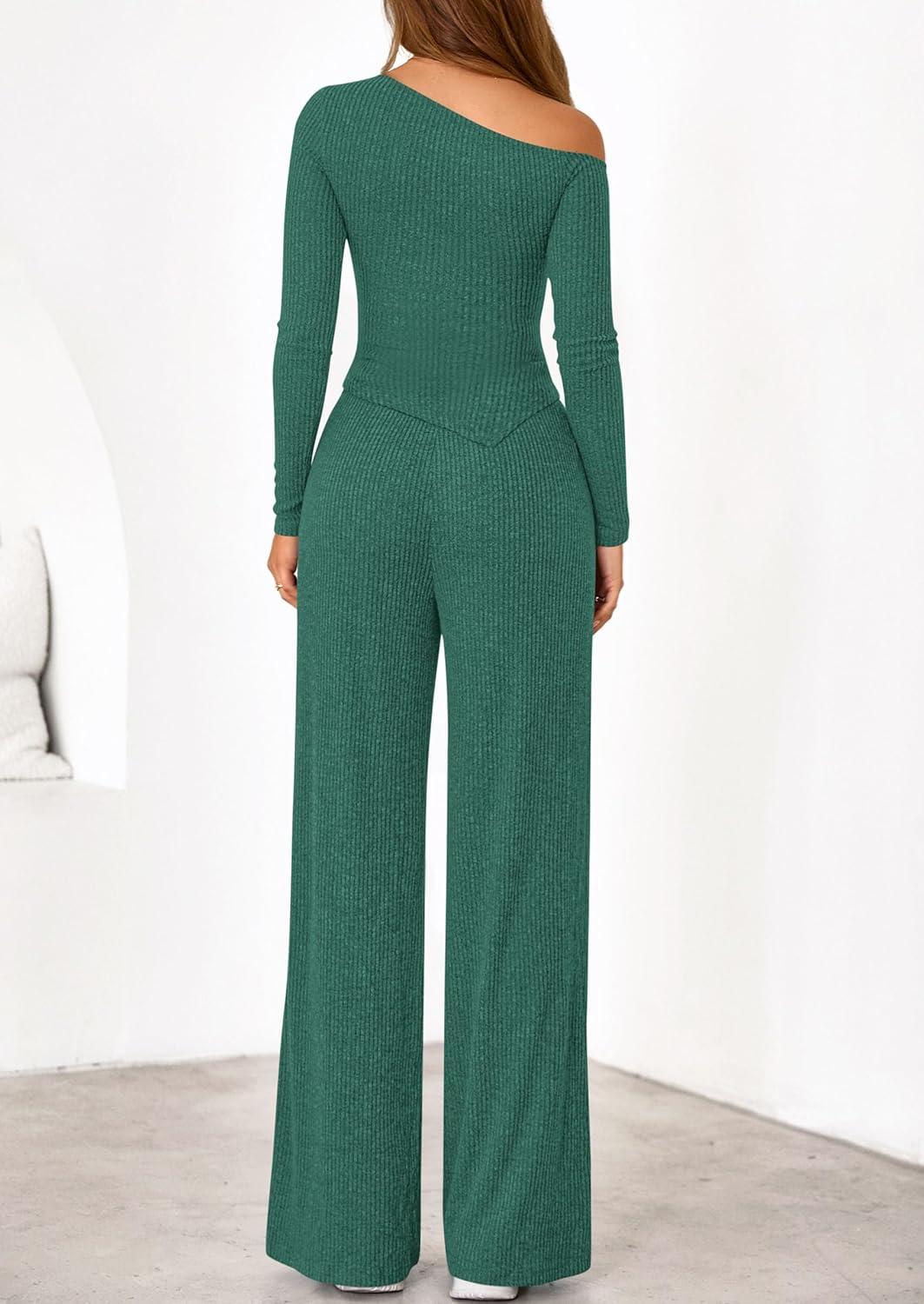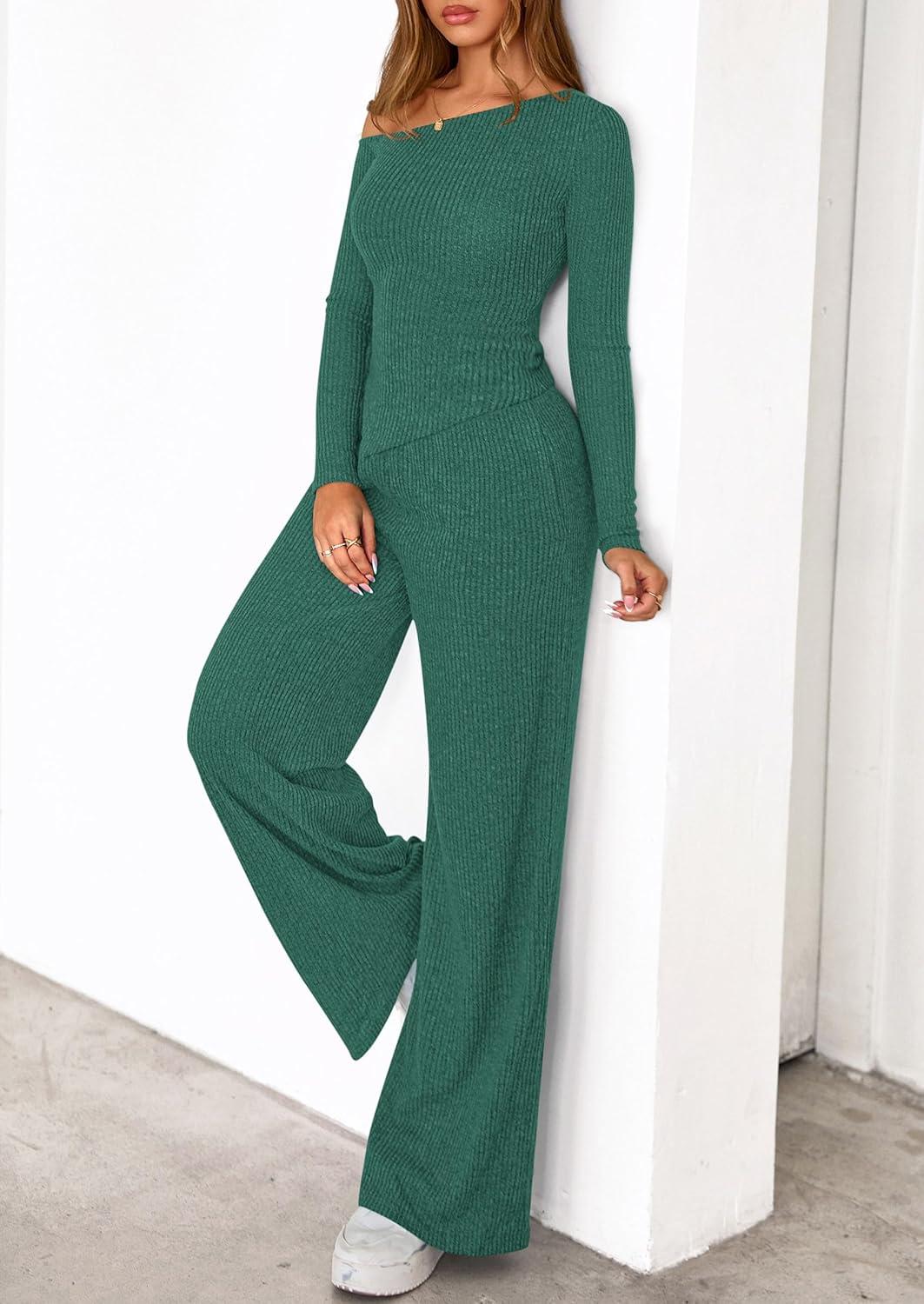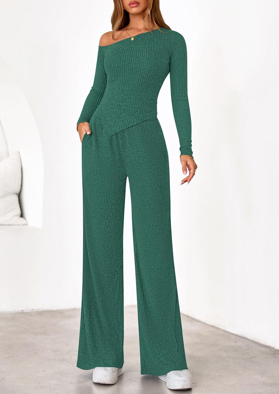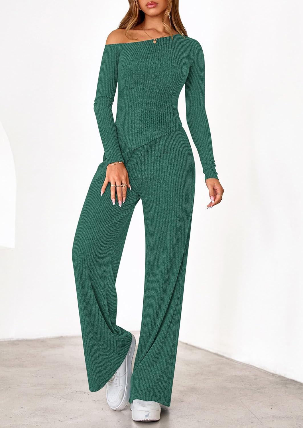 PRETTYGARDEN Fall Two Piece Sets For Women 2025 Off Shoulder Tops Long Pants Knit Matching Lounge Set Airport Travel Outfits(Dark Green)