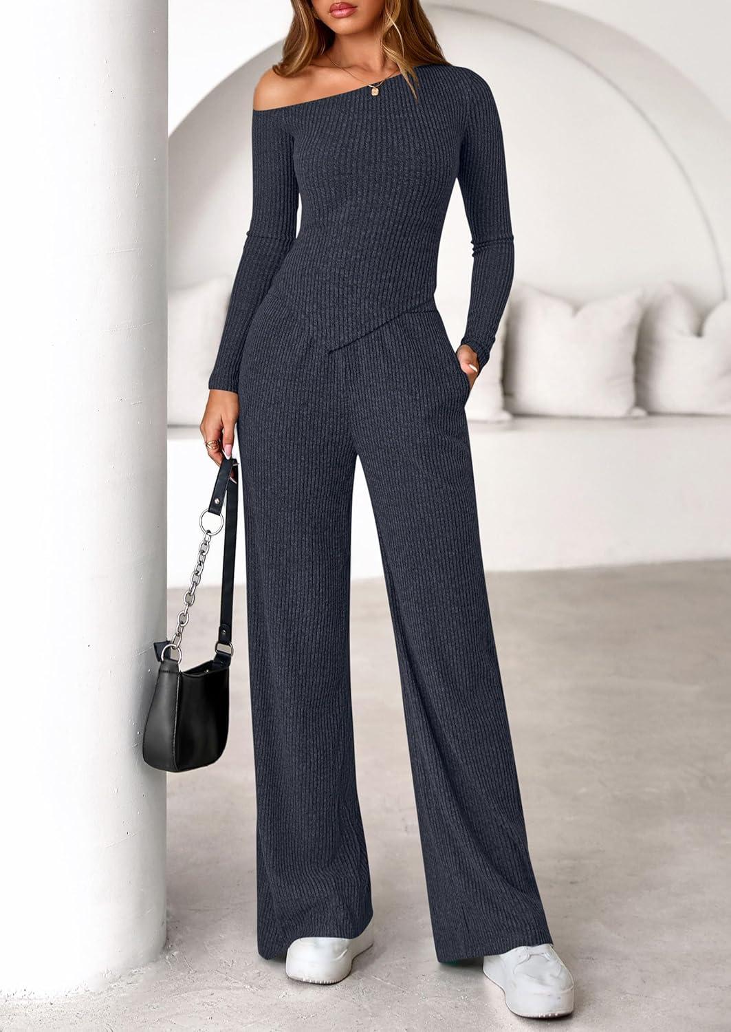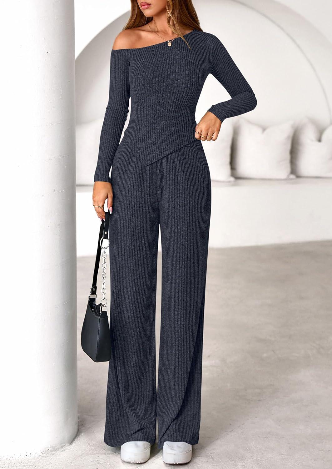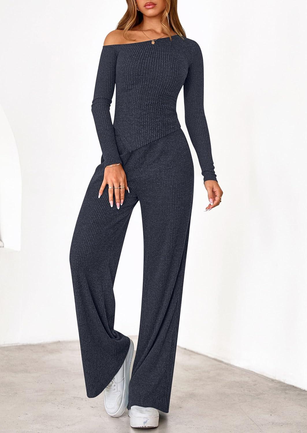 PRETTYGARDEN Fall Two Piece Sets For Women 2025 Off Shoulder Tops Long Pants Knit Matching Lounge Set Airport Travel Outfits(Light Grey)