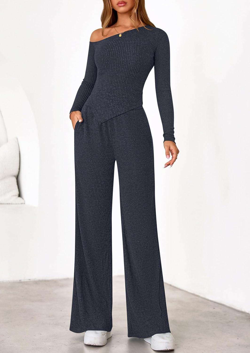 PRETTYGARDEN Fall Two Piece Sets For Women 2025 Off Shoulder Tops Long Pants Knit Matching Lounge Set Airport Travel Outfits(Navy)