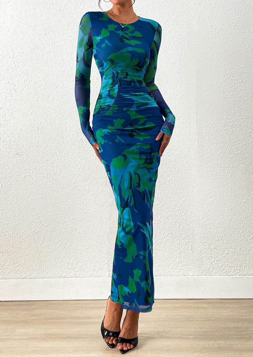 PRETTYGARDEN Fall Wedding Guest Dresses for Women 2025 Long Sleeve Ruched Sexy Bodycon Floral Mesh Cocktail Party Maxi Dress(Green Floral)
