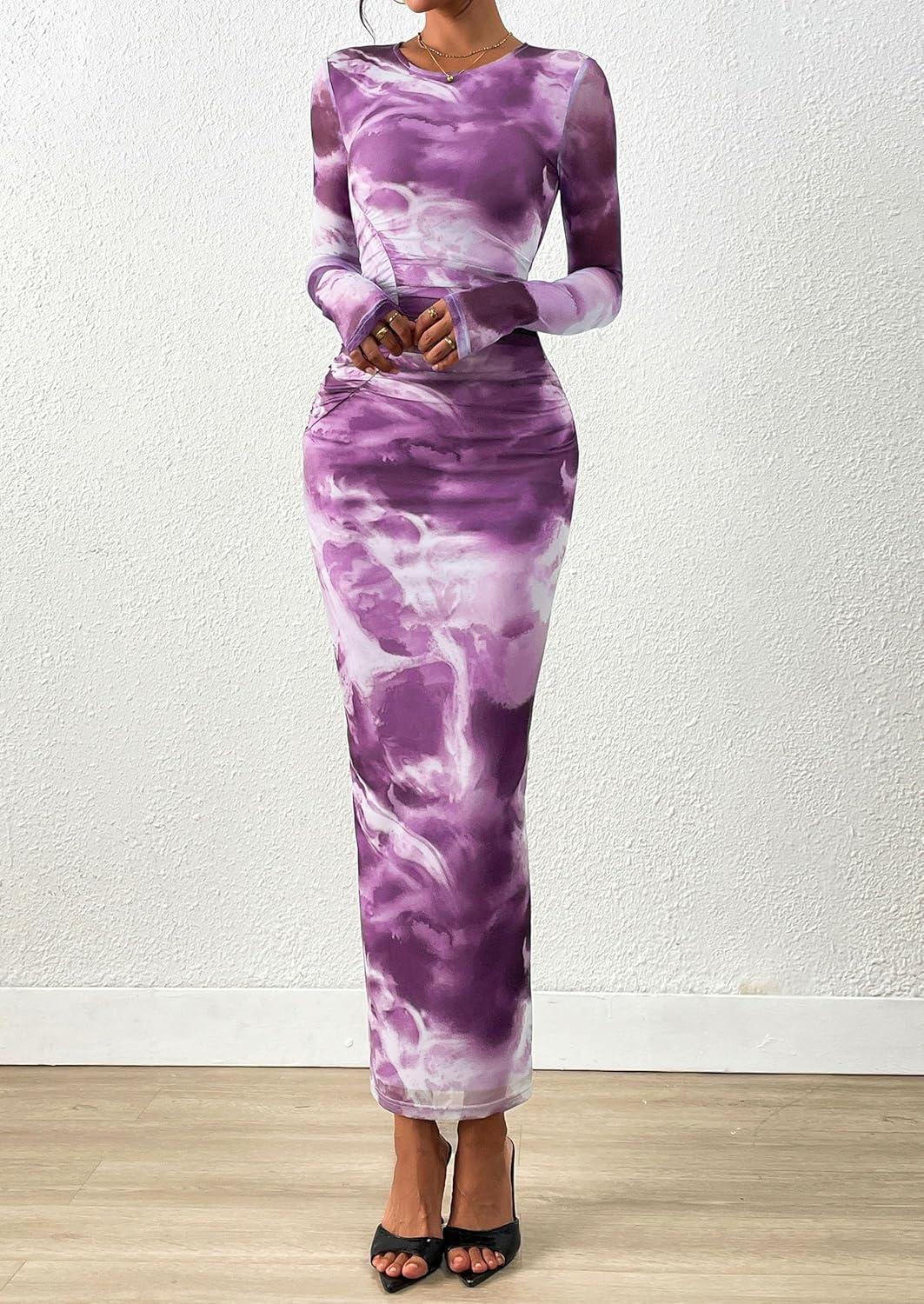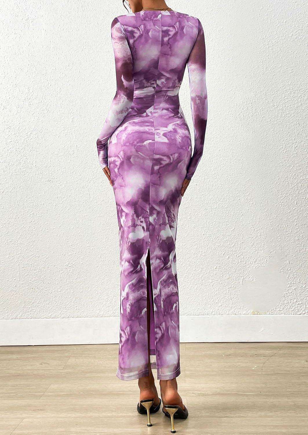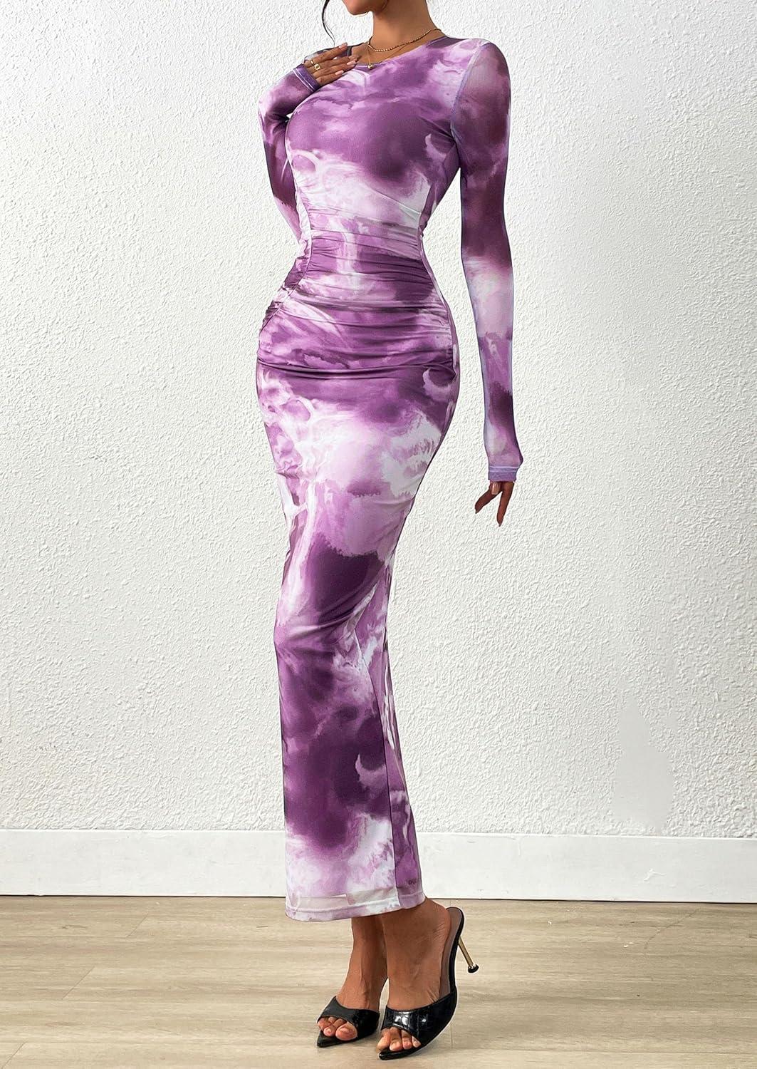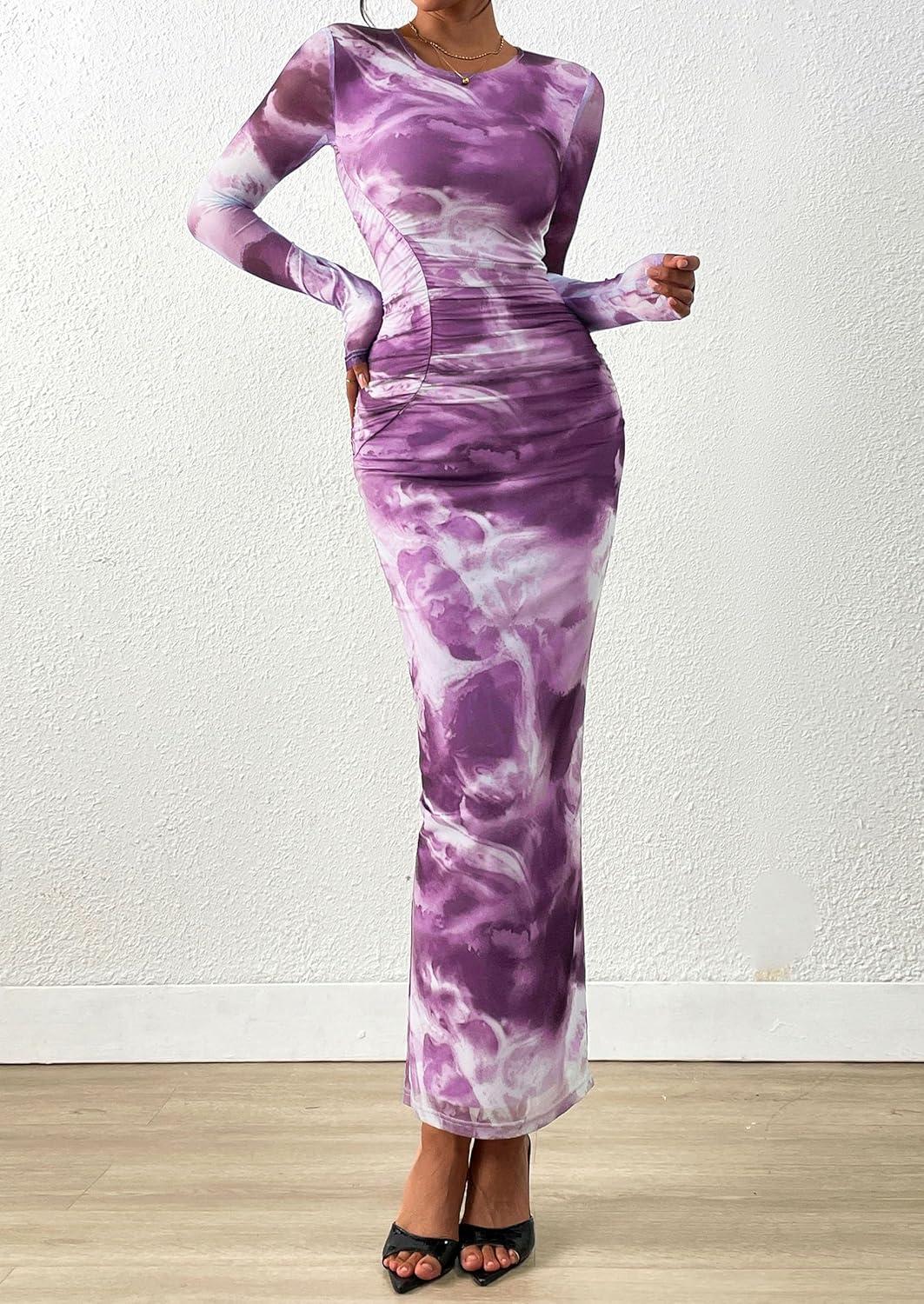 PRETTYGARDEN Fall Wedding Guest Dresses for Women 2025 Long Sleeve Ruched Sexy Bodycon Floral Mesh Cocktail Party Maxi Dress(Grey Purple Floral)
