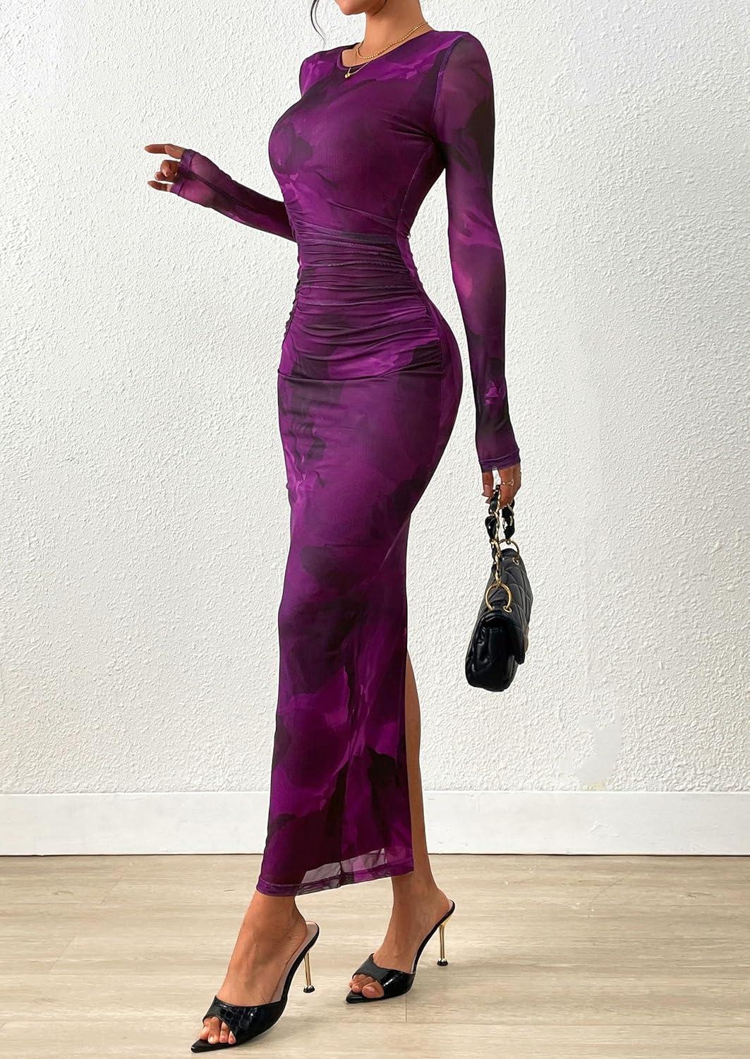 PRETTYGARDEN Fall Wedding Guest Dresses for Women 2025 Long Sleeve Ruched Sexy Bodycon Floral Mesh Cocktail Party Maxi Dress(Purple Floral)