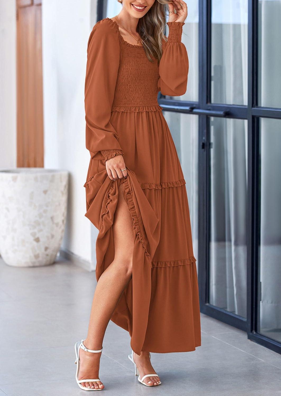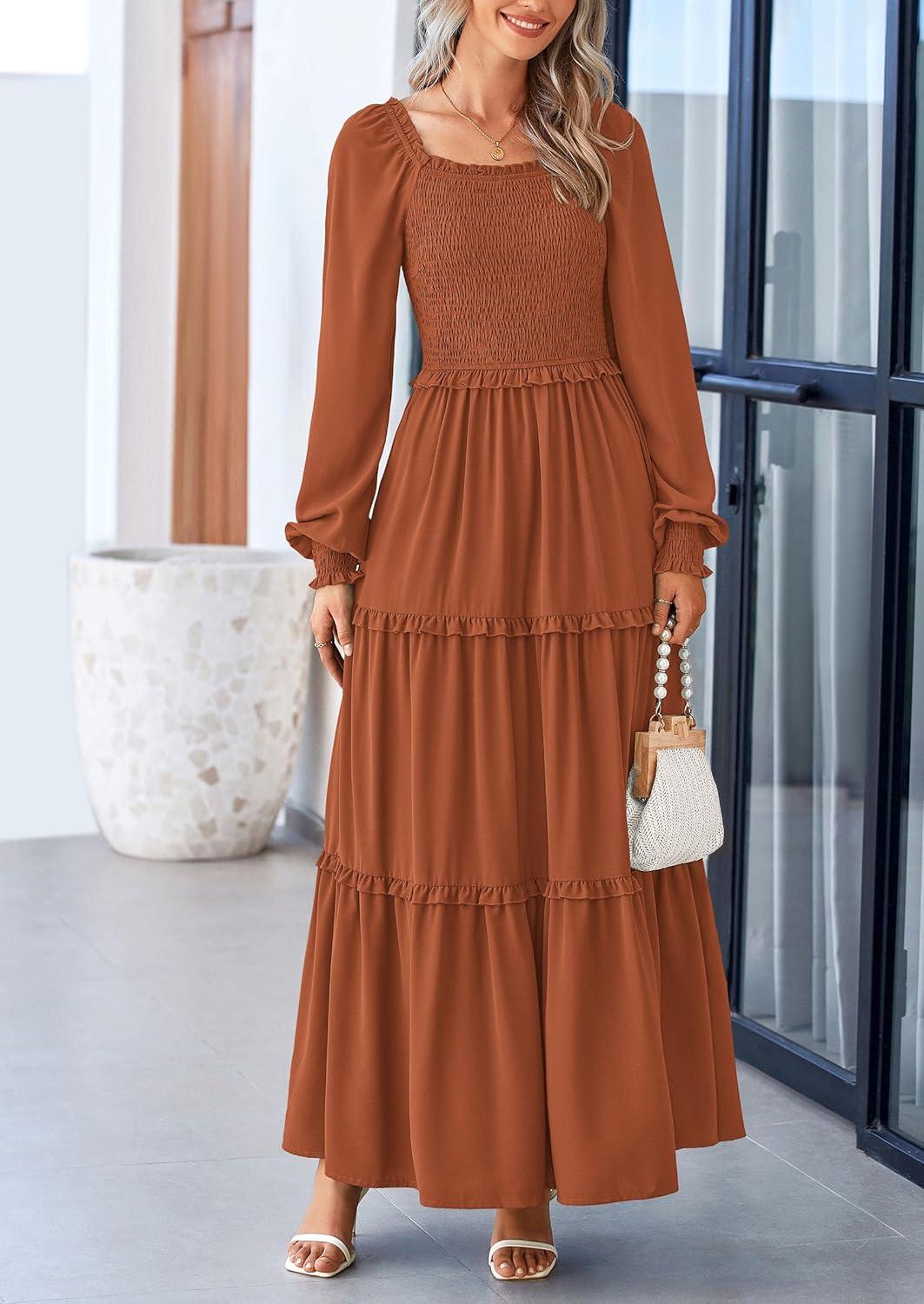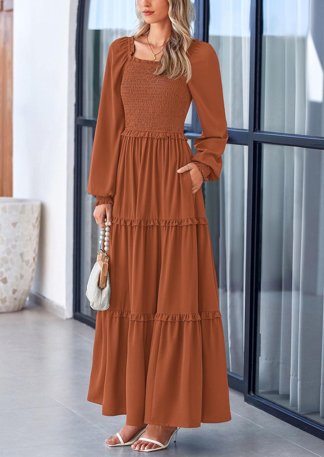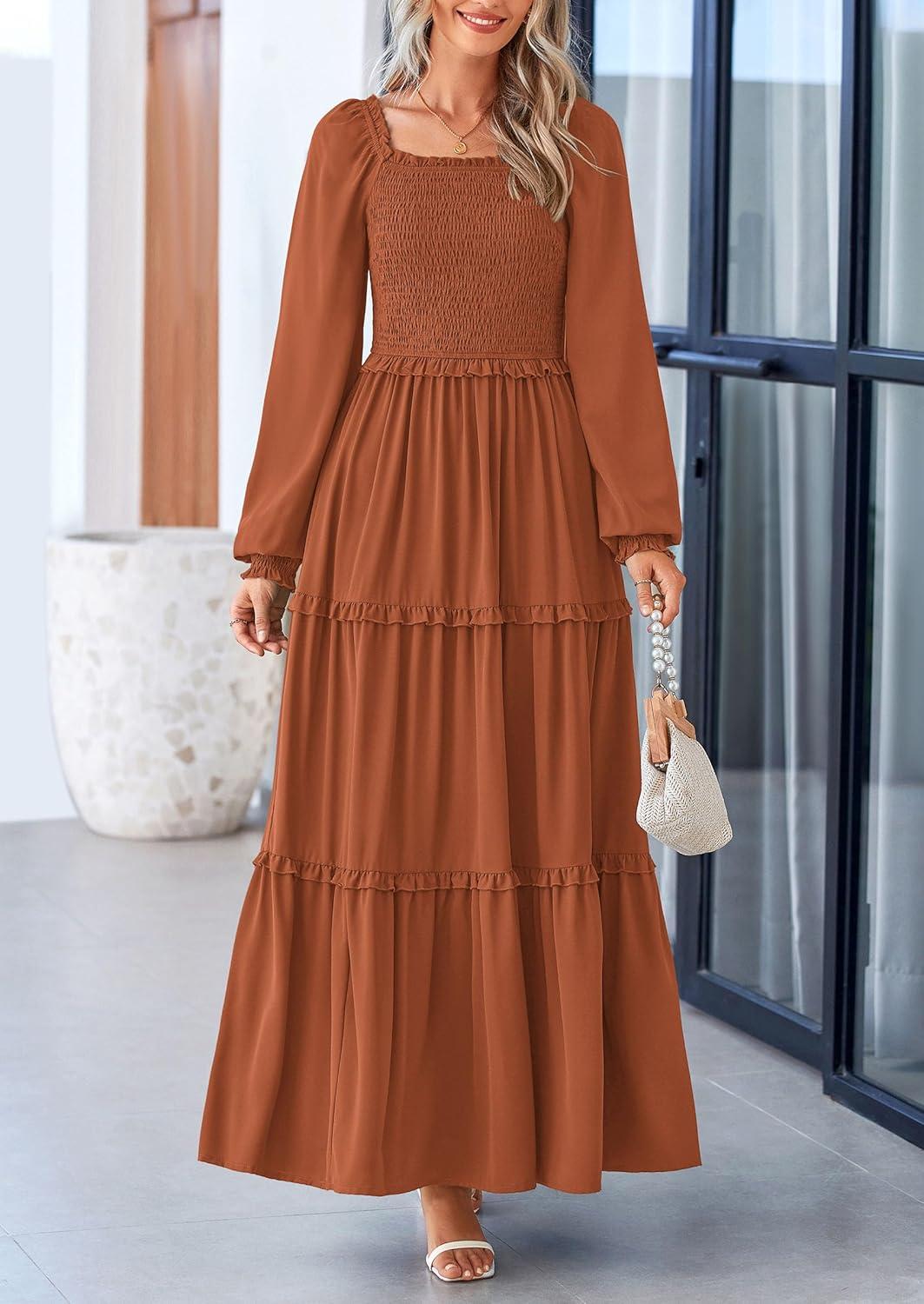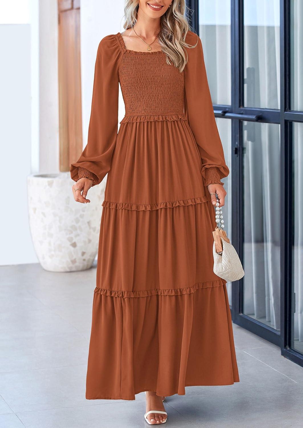 PRETTYGARDEN Fall Wedding Guest Dresses for Women 2025 Long Sleeve Square Neck Tiered A Line Modest Elegant Flowy Dresses(Brown)