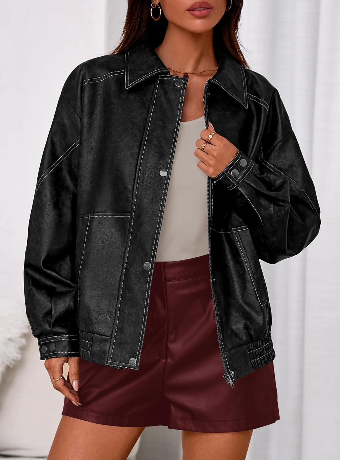 PRETTYGARDEN Faux Leather Jacket Women Bomber Motorcycle Zip Up Jackets Oversized Fall Fashion Outfits 2025 Winter Coats(Black)