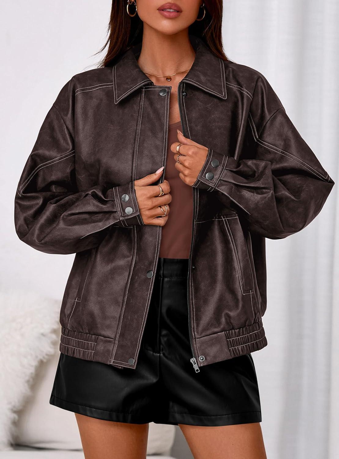 PRETTYGARDEN Faux Leather Jacket Women Bomber Motorcycle Zip Up Jackets Oversized Fall Fashion Outfits 2025 Winter Coats(Dark Brown)