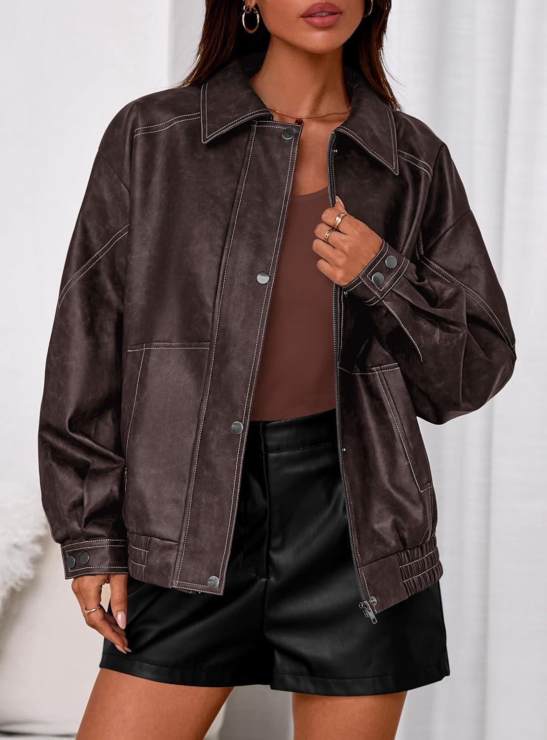 imagePRETTYGARDEN Faux Leather Jacket Women Bomber Motorcycle Zip Up Jackets Oversized Fall Fashion Outfits 2025 Winter CoatsDark Brown