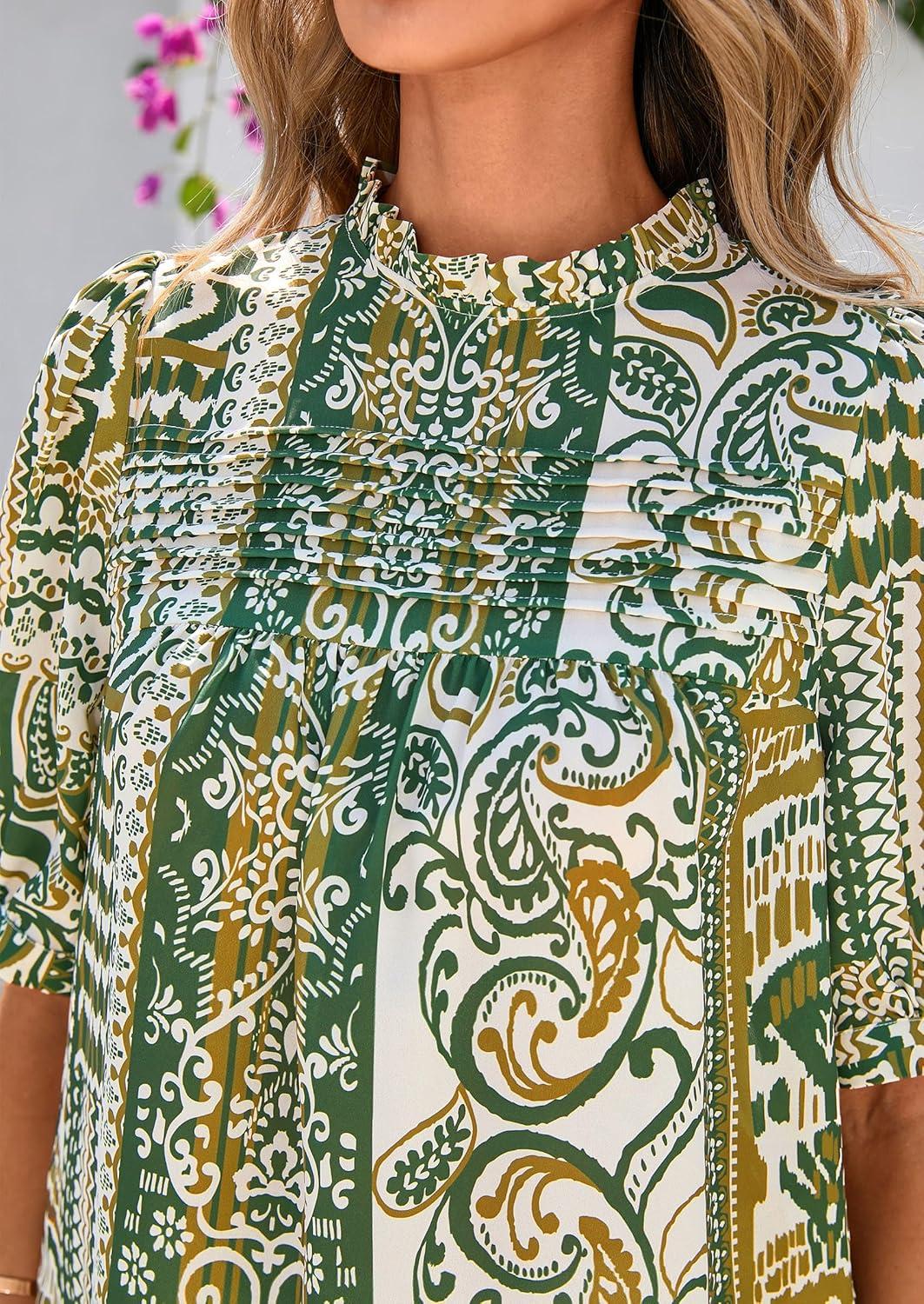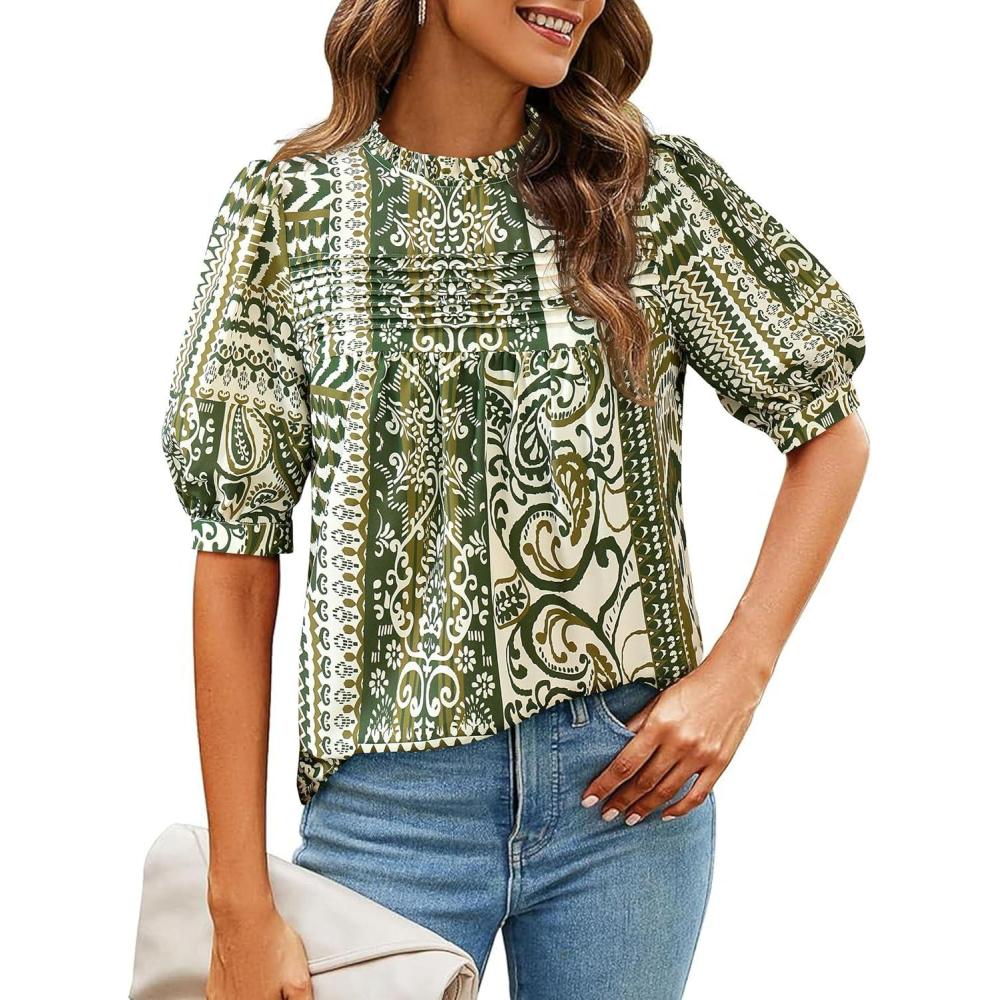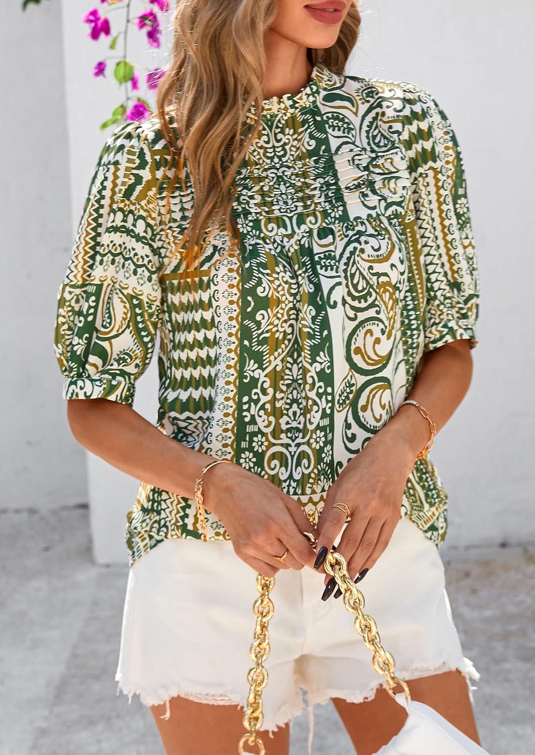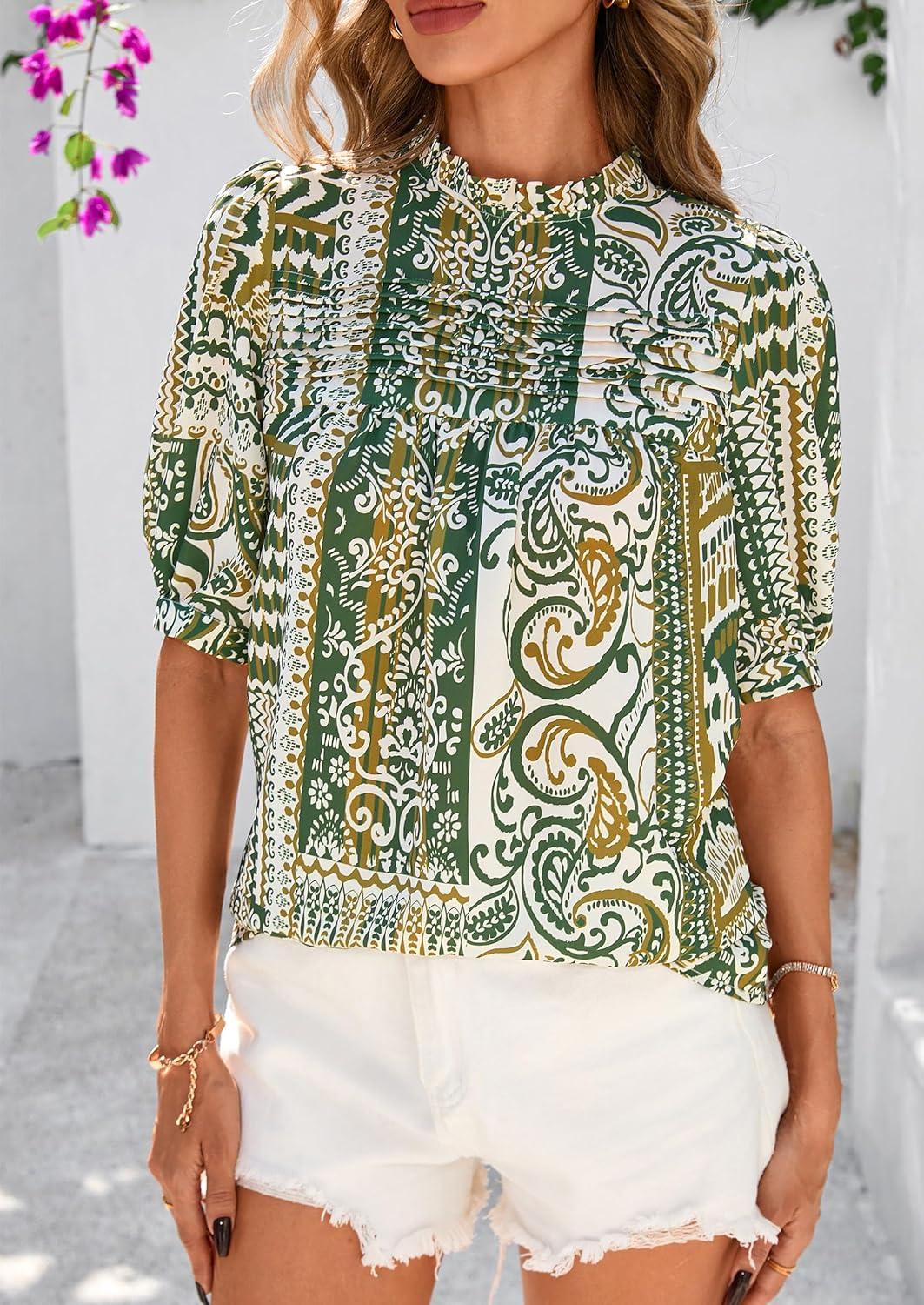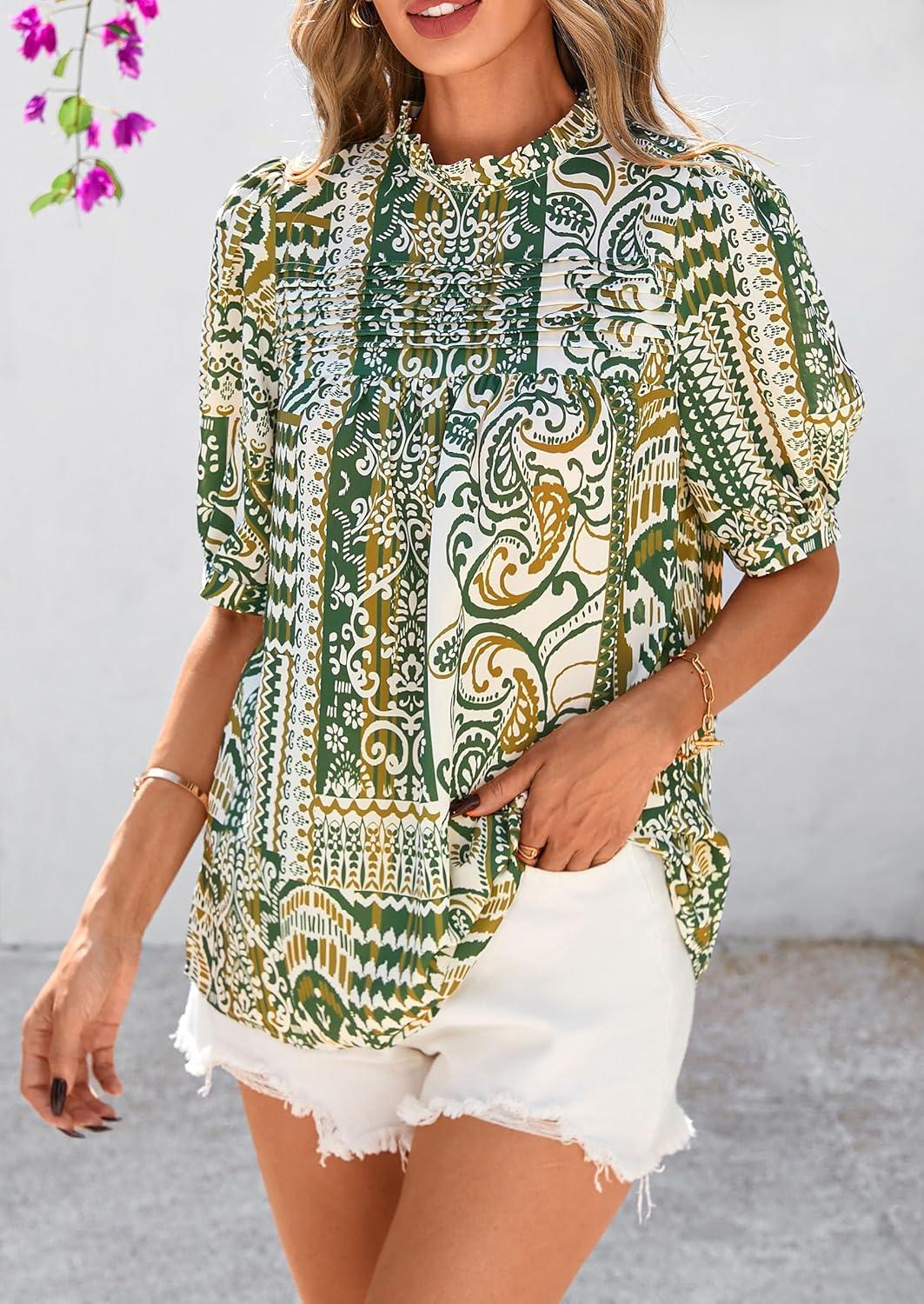 PRETTYGARDEN Floral Tops for Women Blouses Dressy Casual 2025 Summer Trendy Outfits Boho Pleated Short Sleeve Shirts(Floral Army Green)