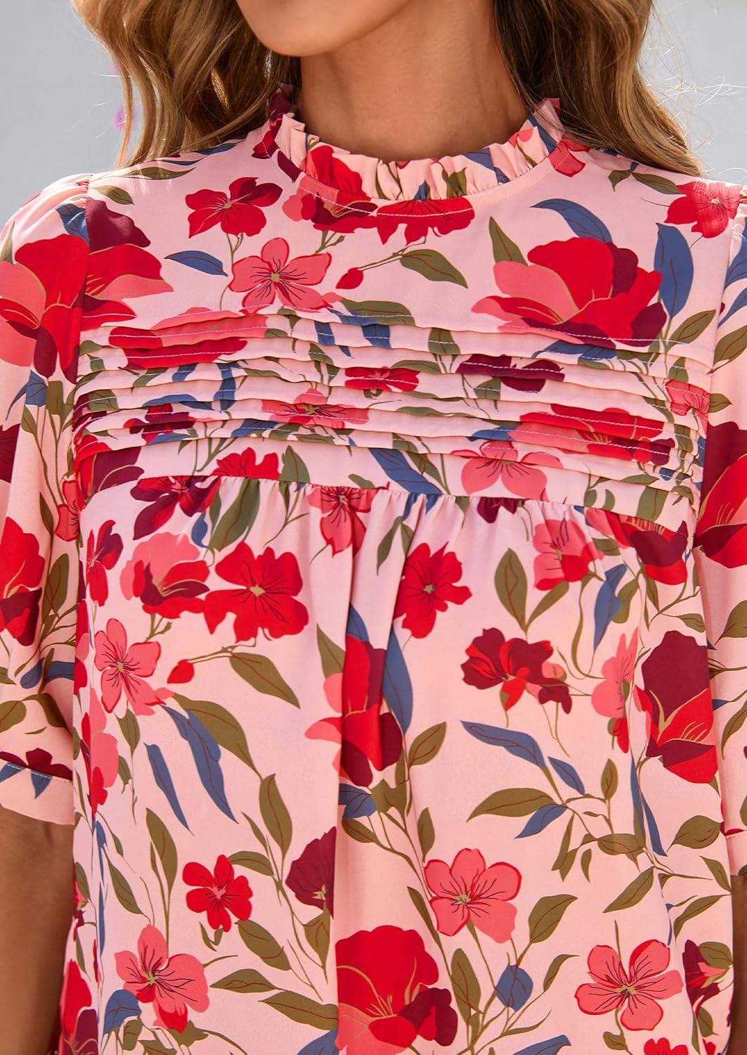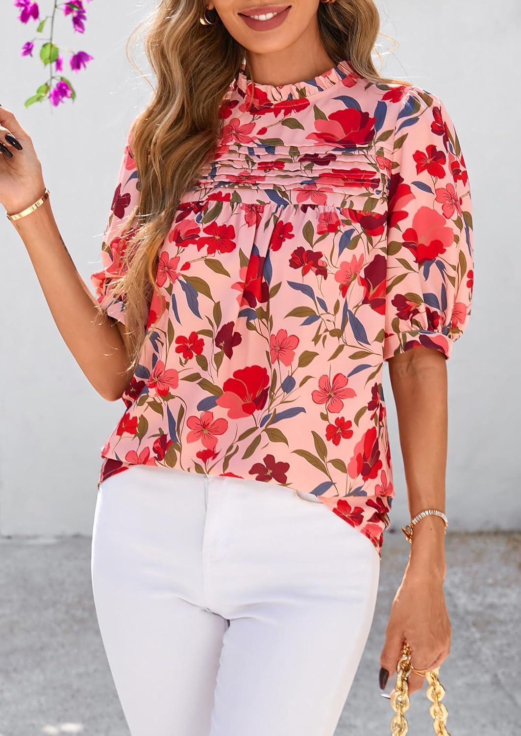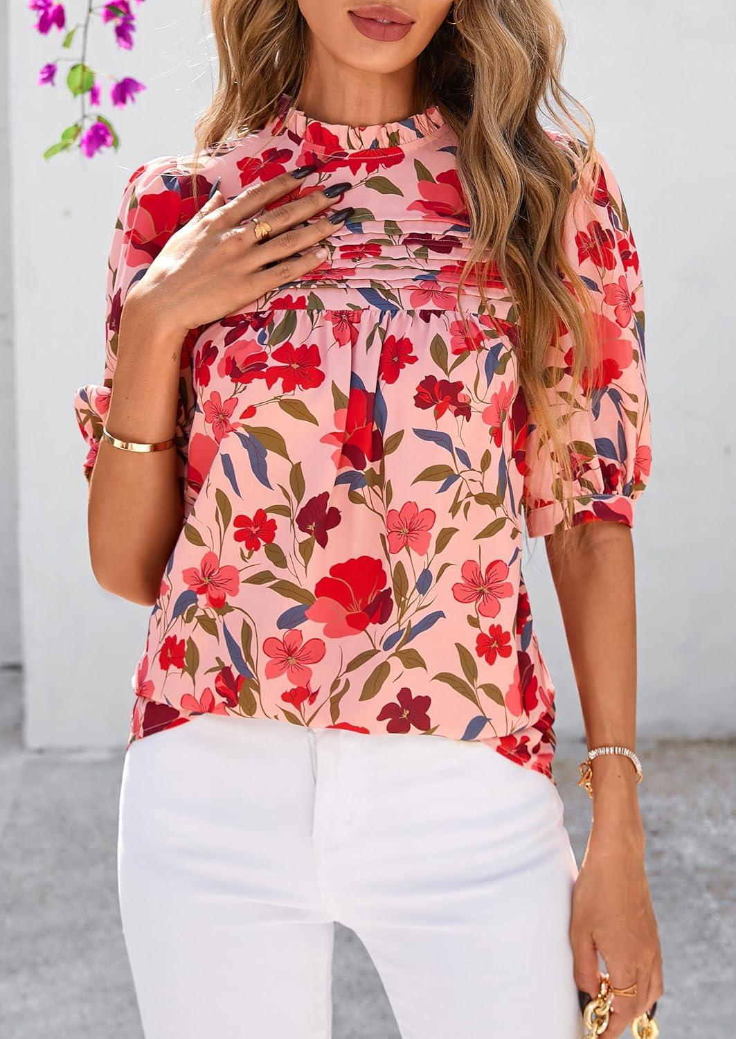 PRETTYGARDEN Floral Tops for Women Blouses Dressy Casual 2025 Summer Trendy Outfits Boho Pleated Short Sleeve Shirts(Pink Red Flower)