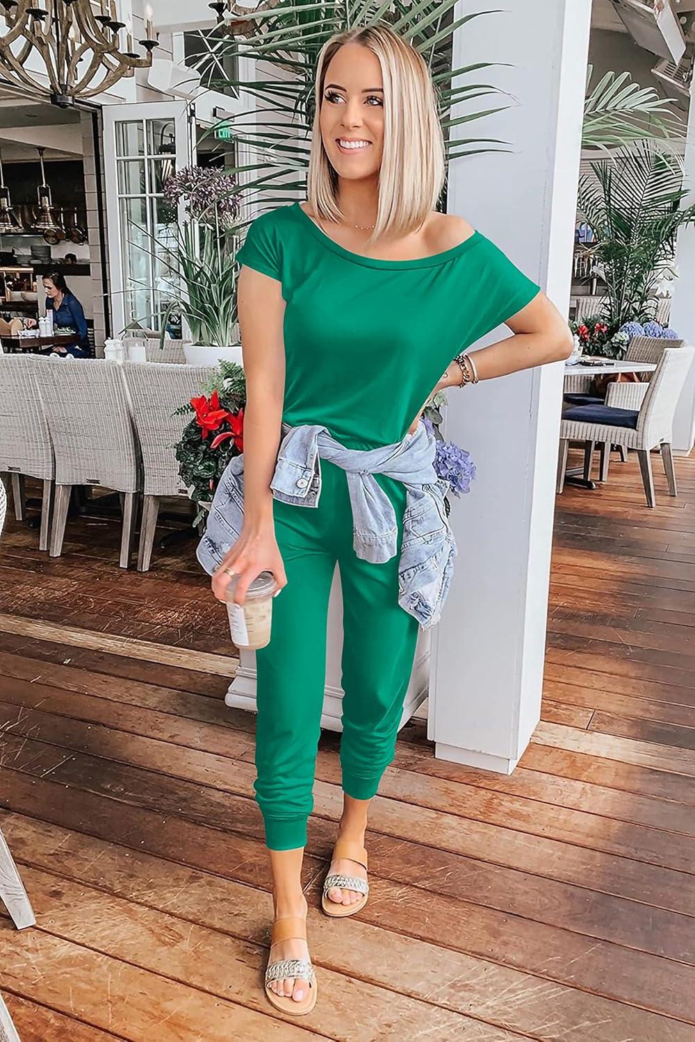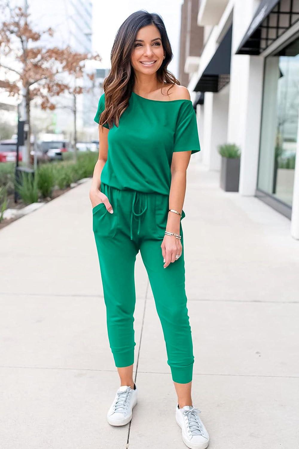 PRETTYGARDEN Jumpsuits for Women 2025 Dressy Casual Off Shoulder Romper Outfits Spring Vacation Travel Summer Lounge Clothes(Dark Green)