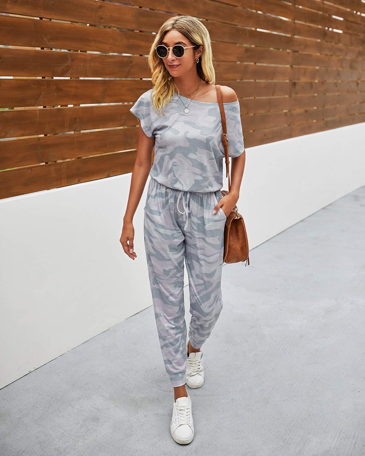 PRETTYGARDEN Jumpsuits for Women 2025 Dressy Casual Off Shoulder Romper Outfits Spring Vacation Travel Summer Lounge Clothes(Grey Camouflage)
