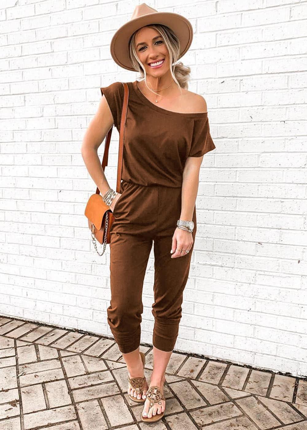 PRETTYGARDEN Jumpsuits for Women 2025 Dressy Casual Off Shoulder Romper Outfits Spring Vacation Travel Summer Lounge Clothes(Light Brown)