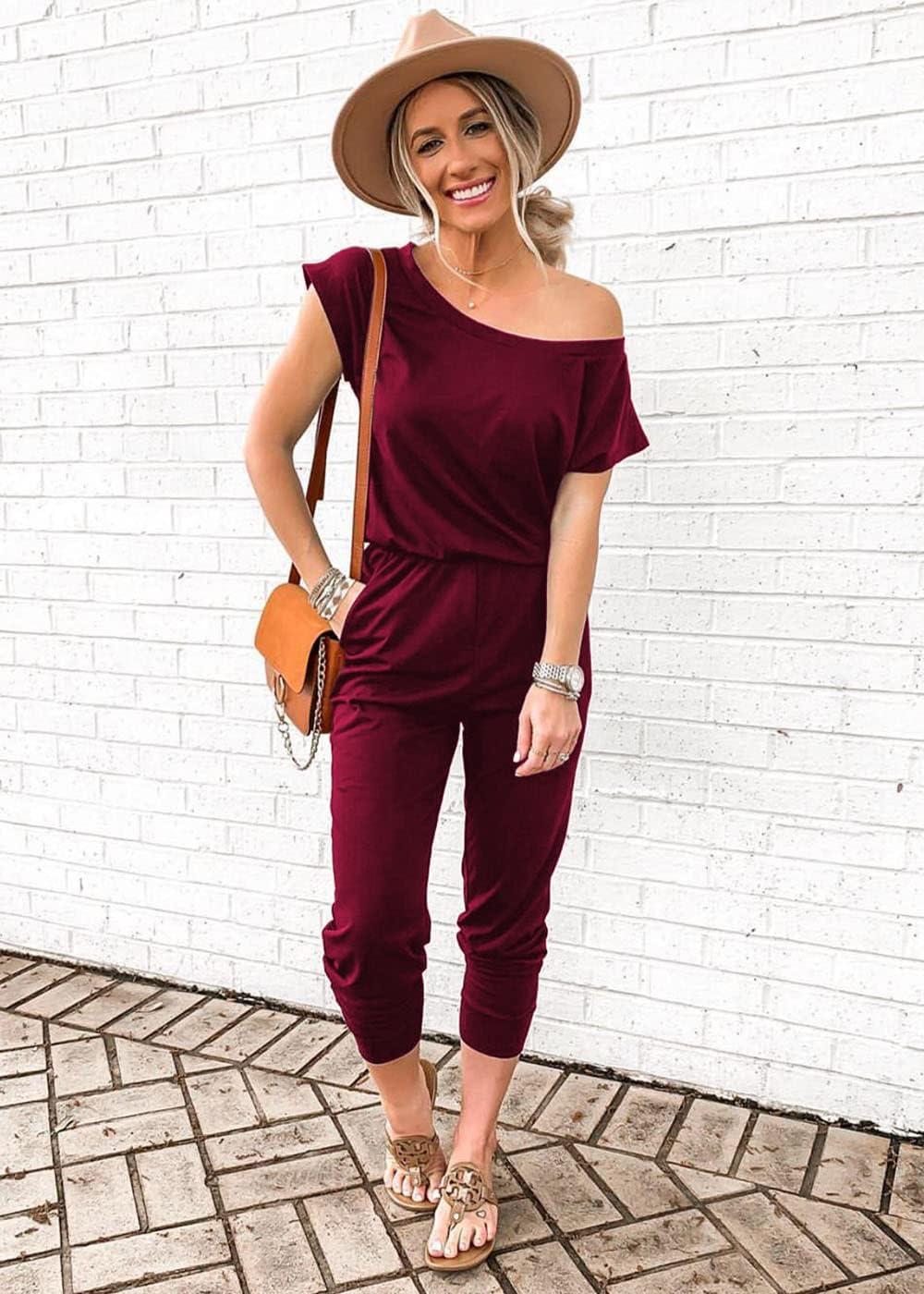PRETTYGARDEN Jumpsuits for Women 2025 Dressy Casual Off Shoulder Romper Outfits Spring Vacation Travel Summer Lounge Clothes(Wine Red)
