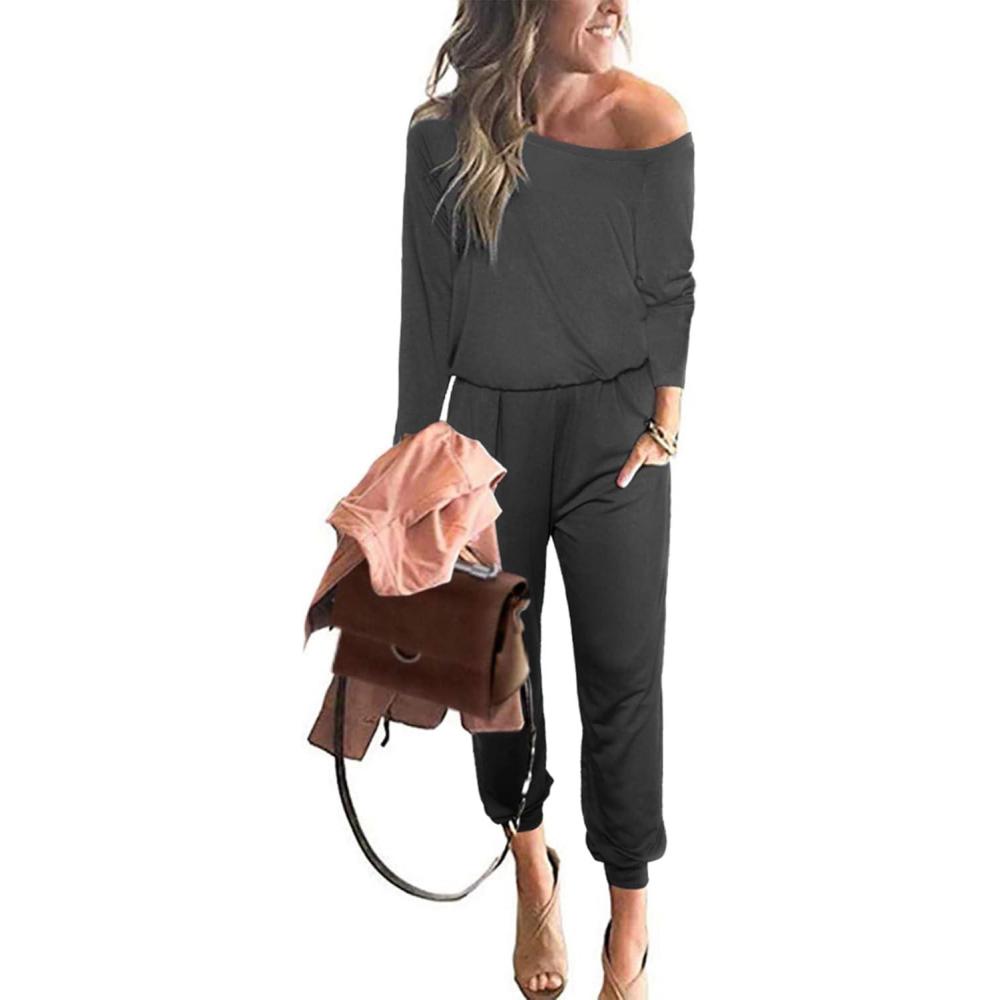 PRETTYGARDEN Jumpsuits for Women Dressy 2025 Fall Long Sleeve Off Shoulder Elastic Waist Rompers One Piece Travel Outfits(Black Grey)