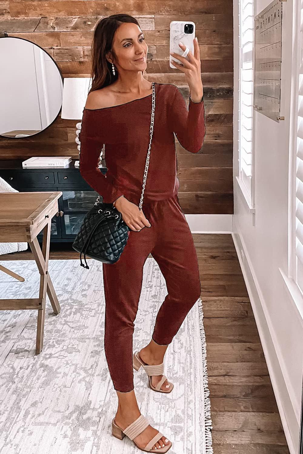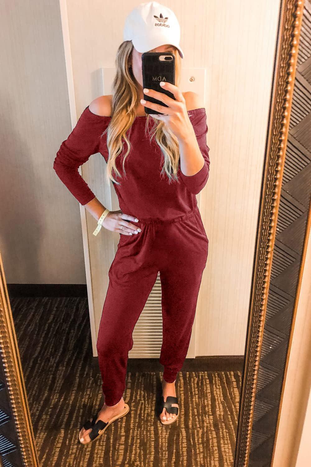 PRETTYGARDEN Jumpsuits for Women Dressy 2025 Fall Long Sleeve Off Shoulder Elastic Waist Rompers One Piece Travel Outfits(Brick Red)