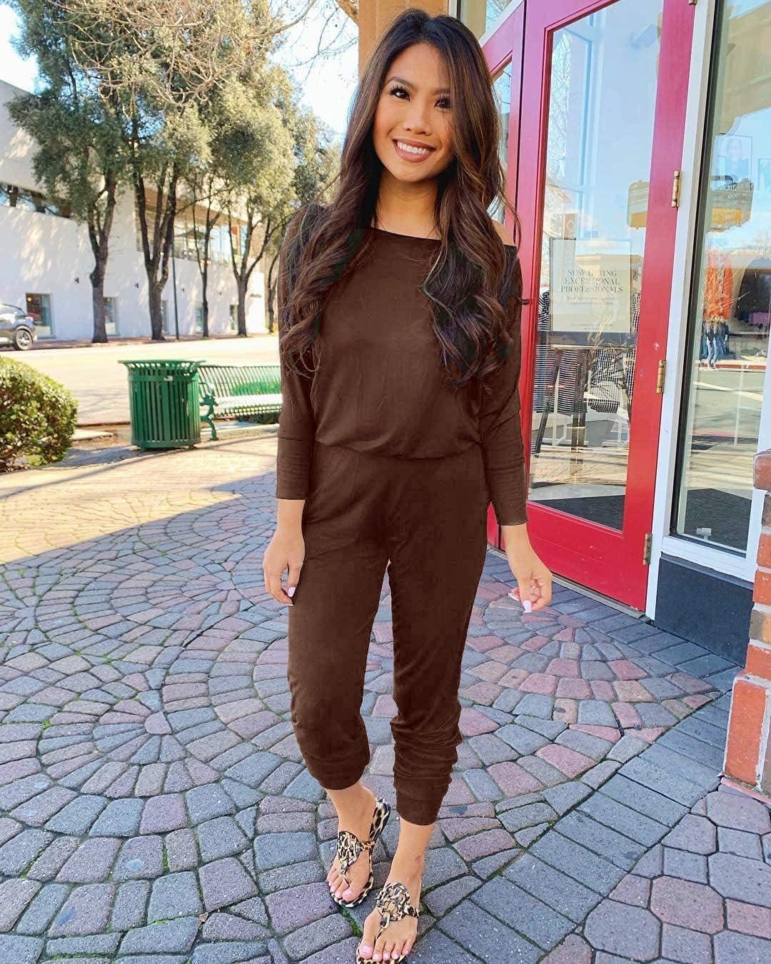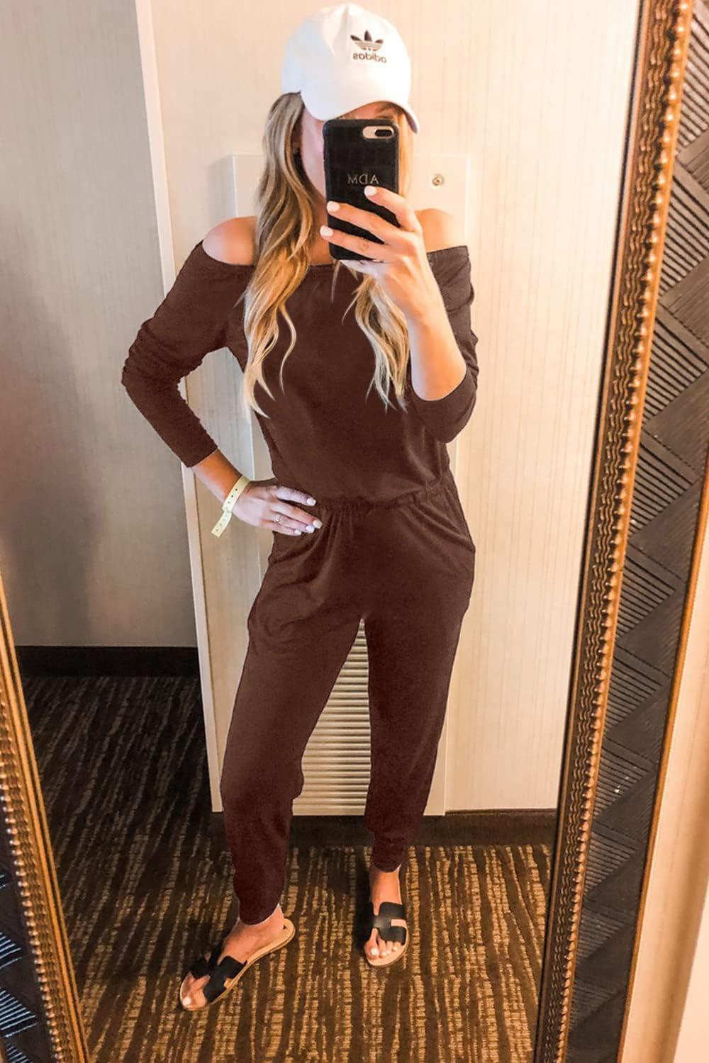 PRETTYGARDEN Jumpsuits for Women Dressy 2025 Fall Long Sleeve Off Shoulder Elastic Waist Rompers One Piece Travel Outfits(Brown)