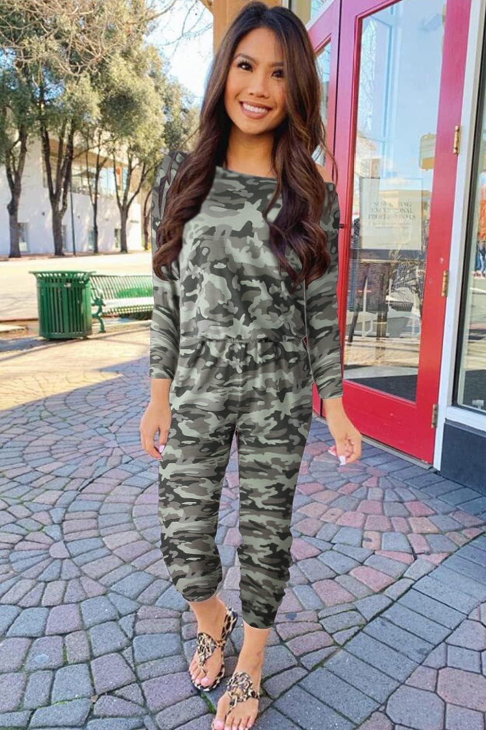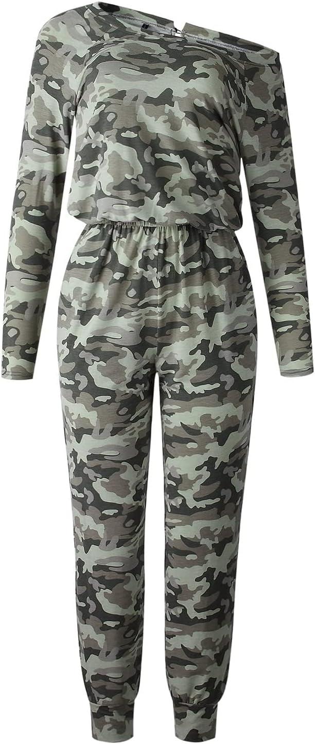 PRETTYGARDEN Jumpsuits for Women Dressy 2025 Fall Long Sleeve Off Shoulder Elastic Waist Rompers One Piece Travel Outfits(Camo)