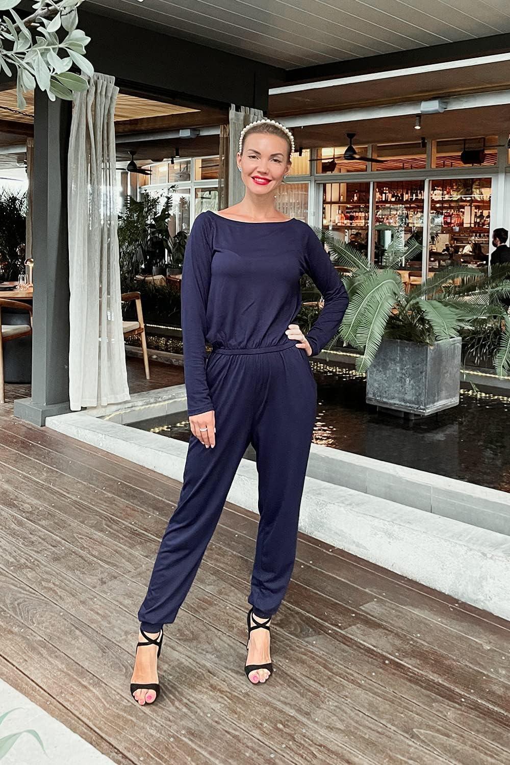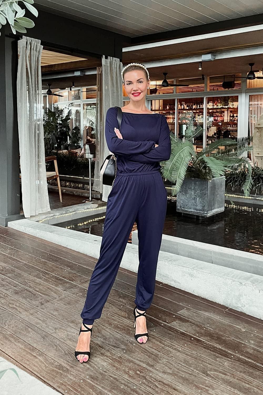PRETTYGARDEN Jumpsuits for Women Dressy 2025 Fall Long Sleeve Off Shoulder Elastic Waist Rompers One Piece Travel Outfits(Navy)