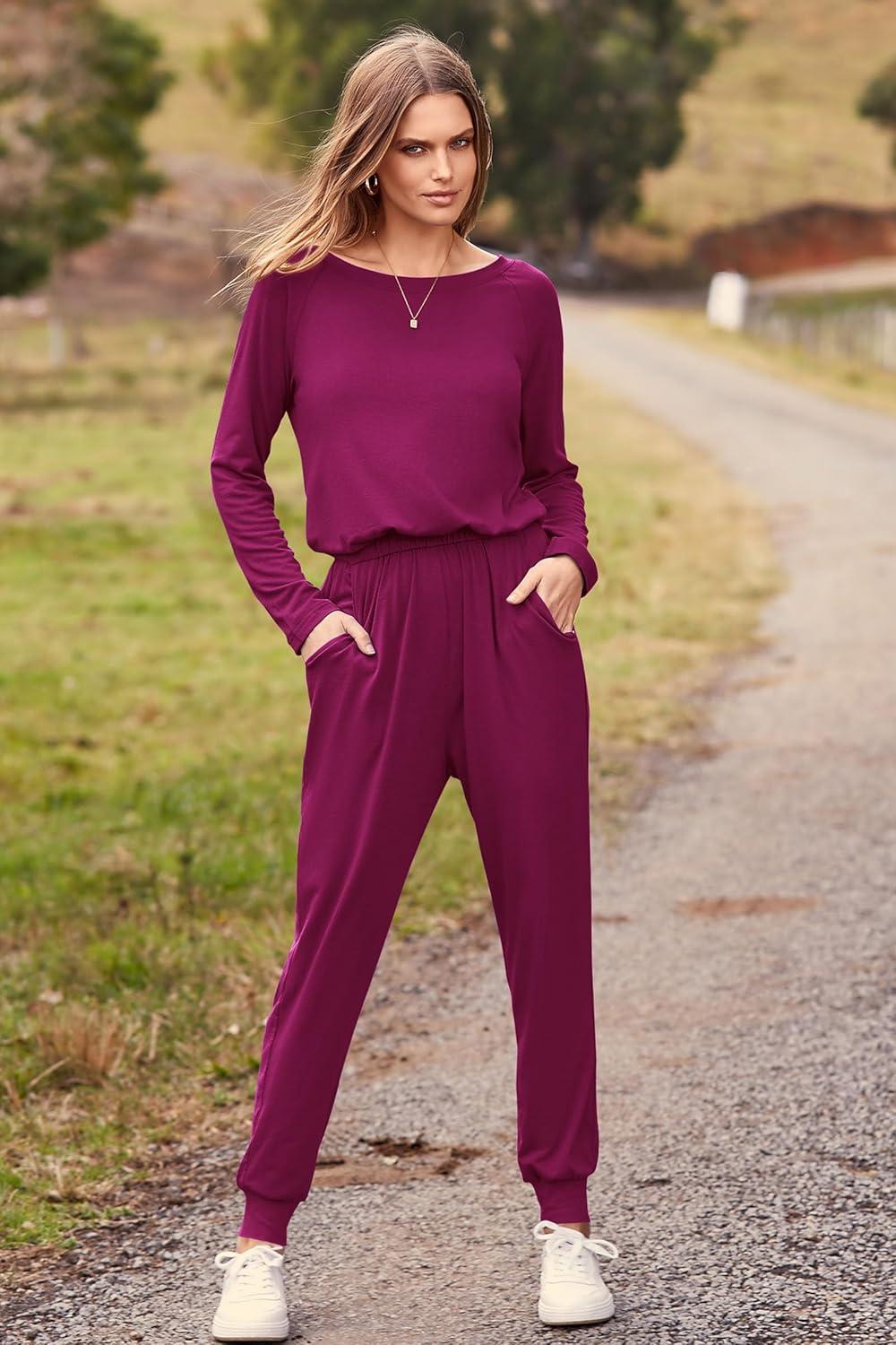 PRETTYGARDEN Jumpsuits for Women Dressy 2025 Fall Long Sleeve Off Shoulder Elastic Waist Rompers One Piece Travel Outfits(Wine Red)