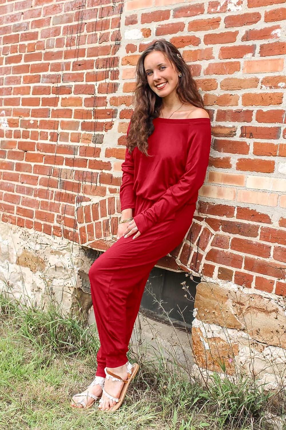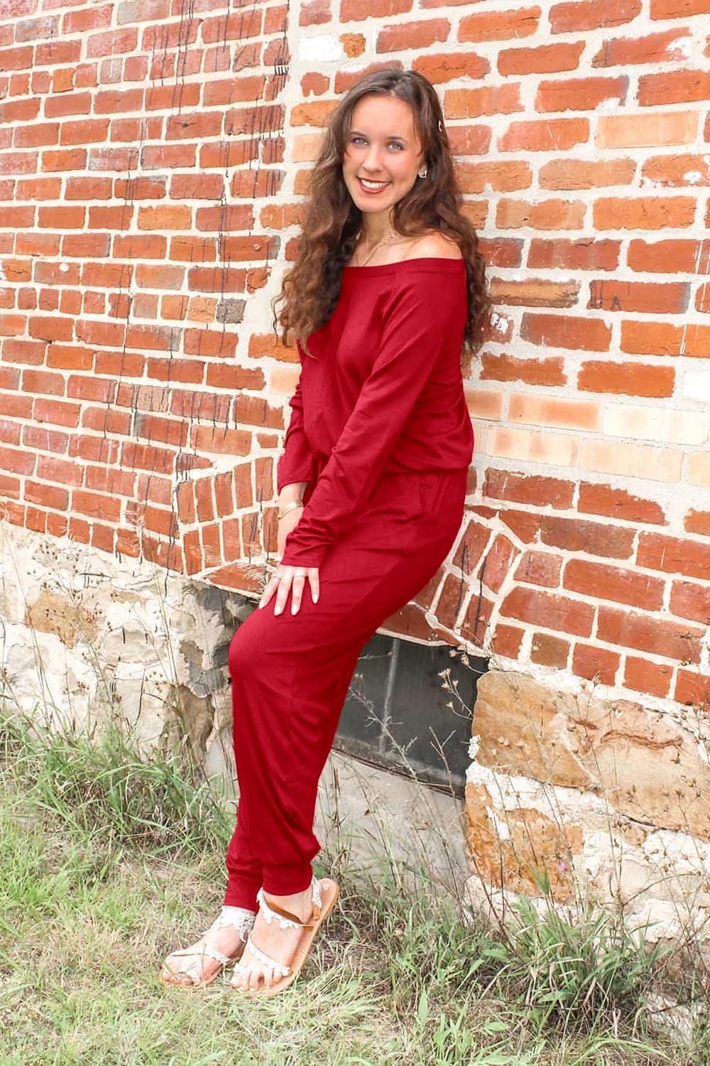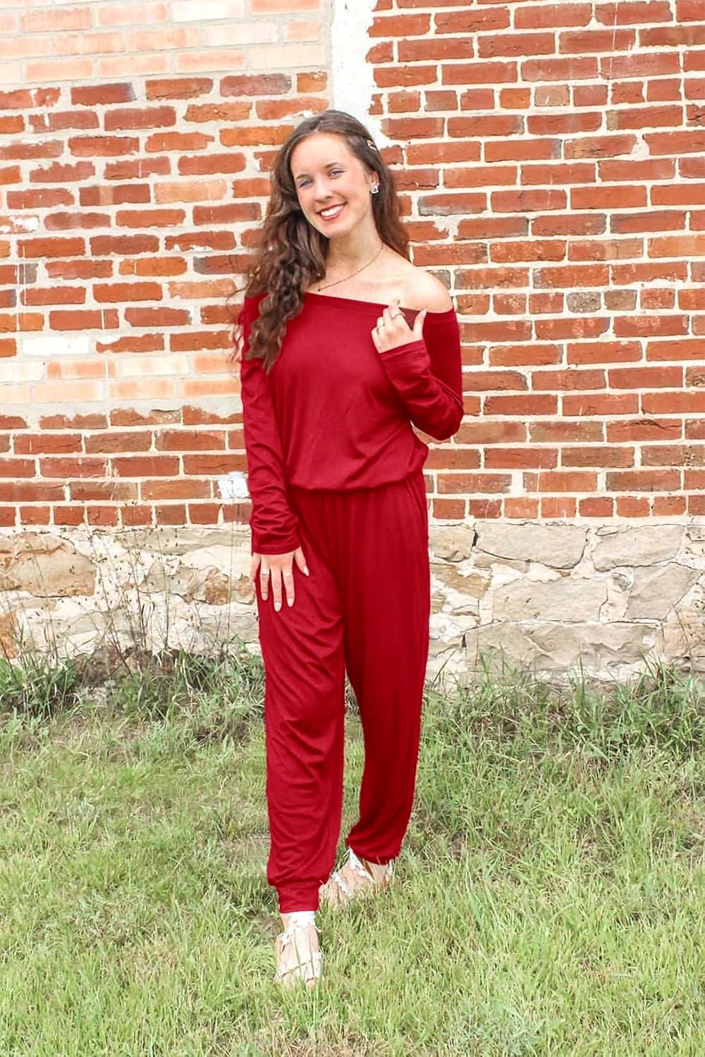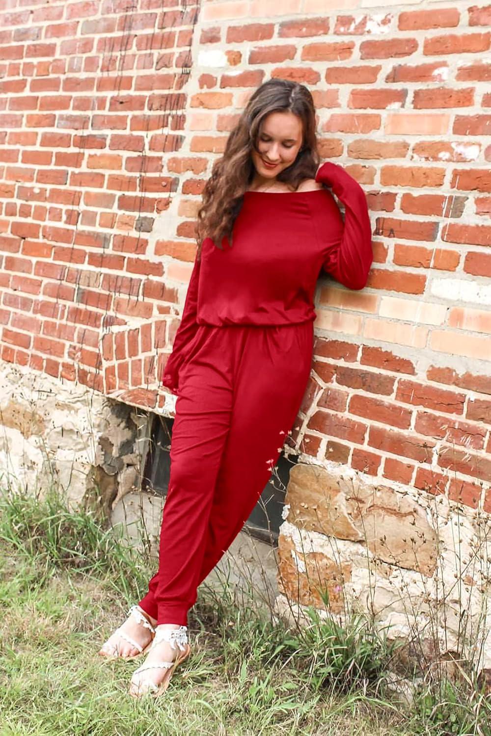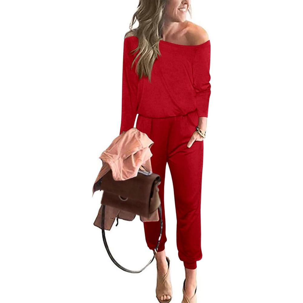 PRETTYGARDEN Jumpsuits for Women Dressy 2025 Fall Long Sleeve Off Shoulder Elastic Waist Rompers One Piece Travel Outfits(Red)