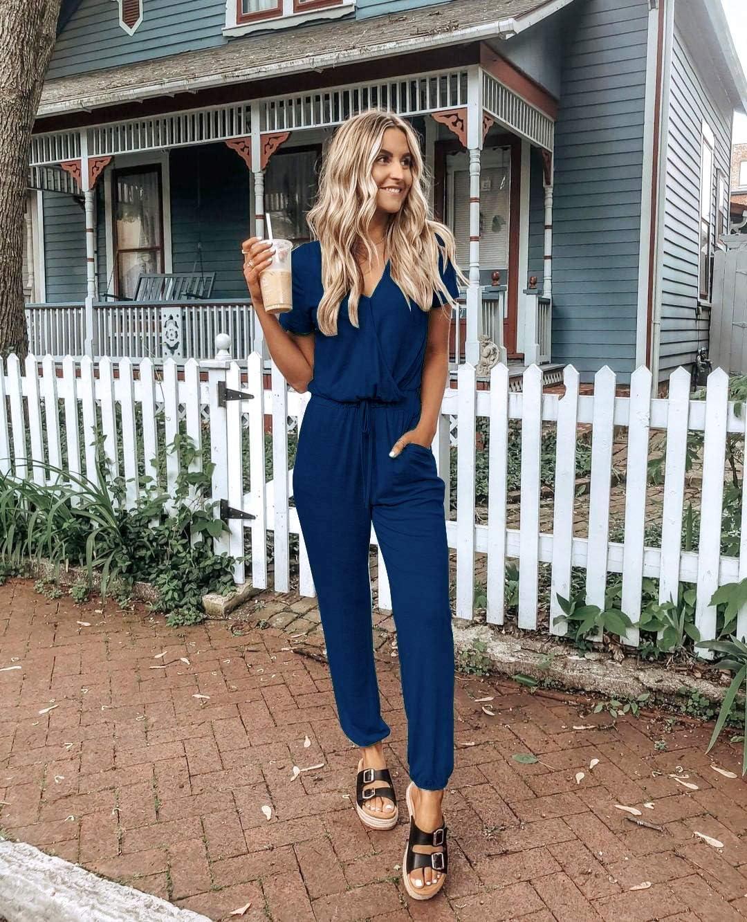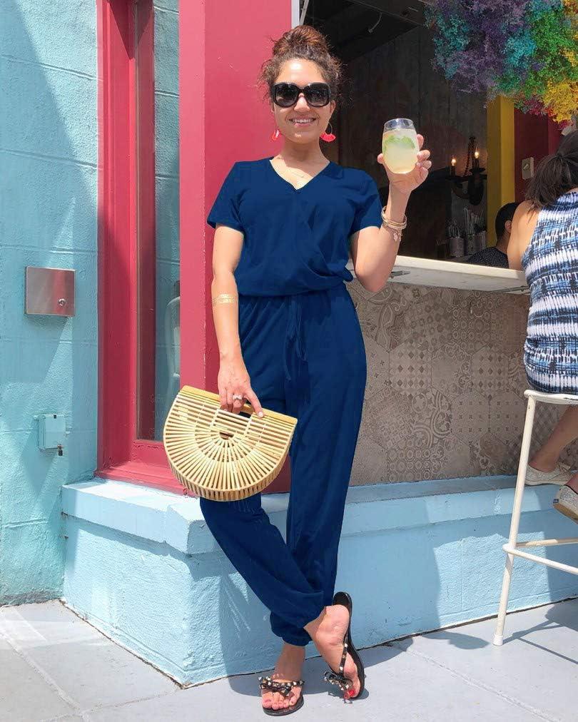 imagePRETTYGARDEN Jumpsuits for Women Dressy 2025 Summer Casual Short Sleeve Romper Spring Airport Beach Vacation Travel OutfitsDark Blue