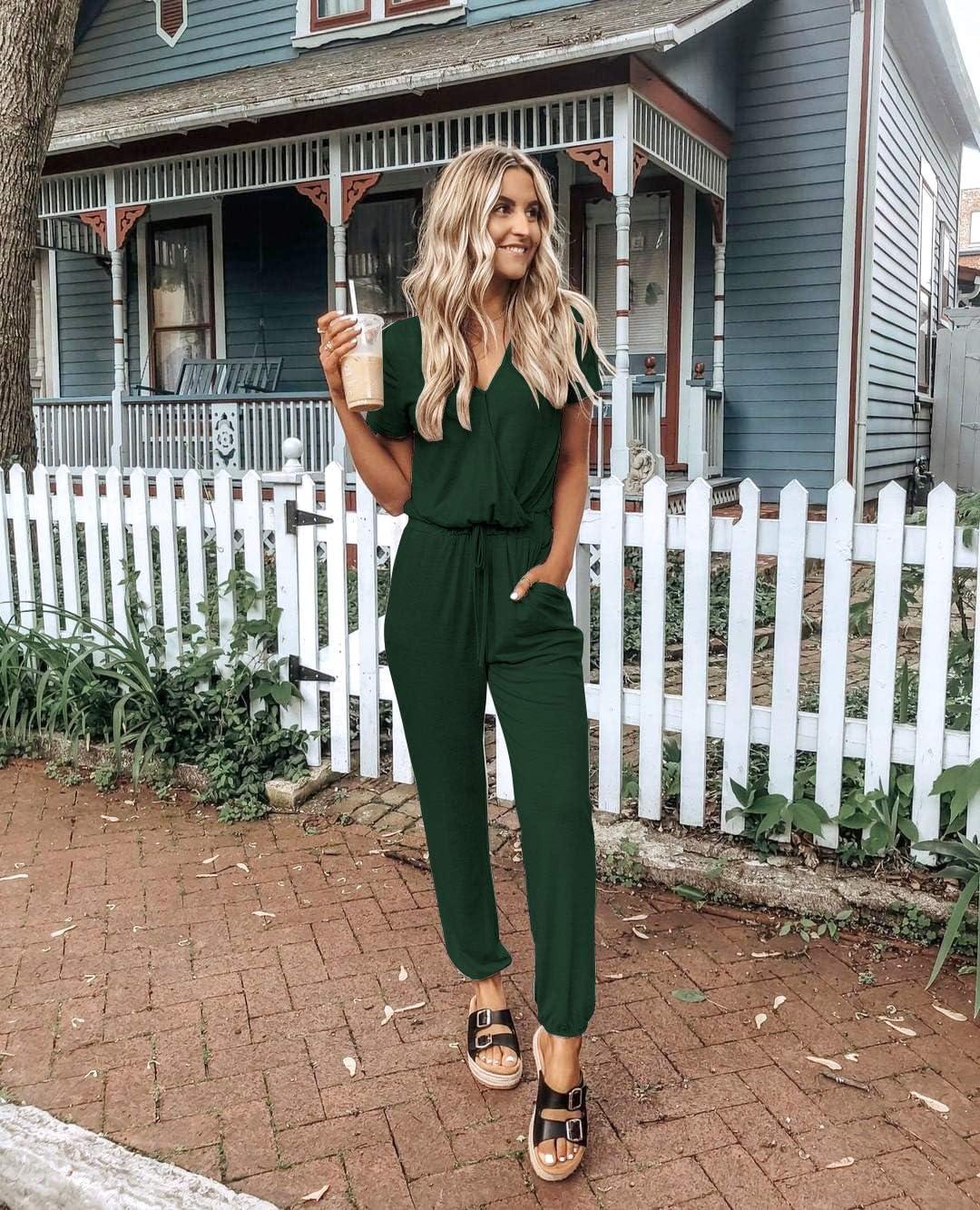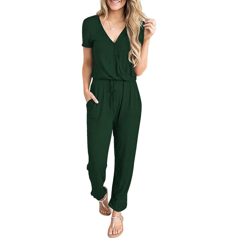 imagePRETTYGARDEN Jumpsuits for Women Dressy 2025 Summer Casual Short Sleeve Romper Spring Airport Beach Vacation Travel OutfitsDark Green